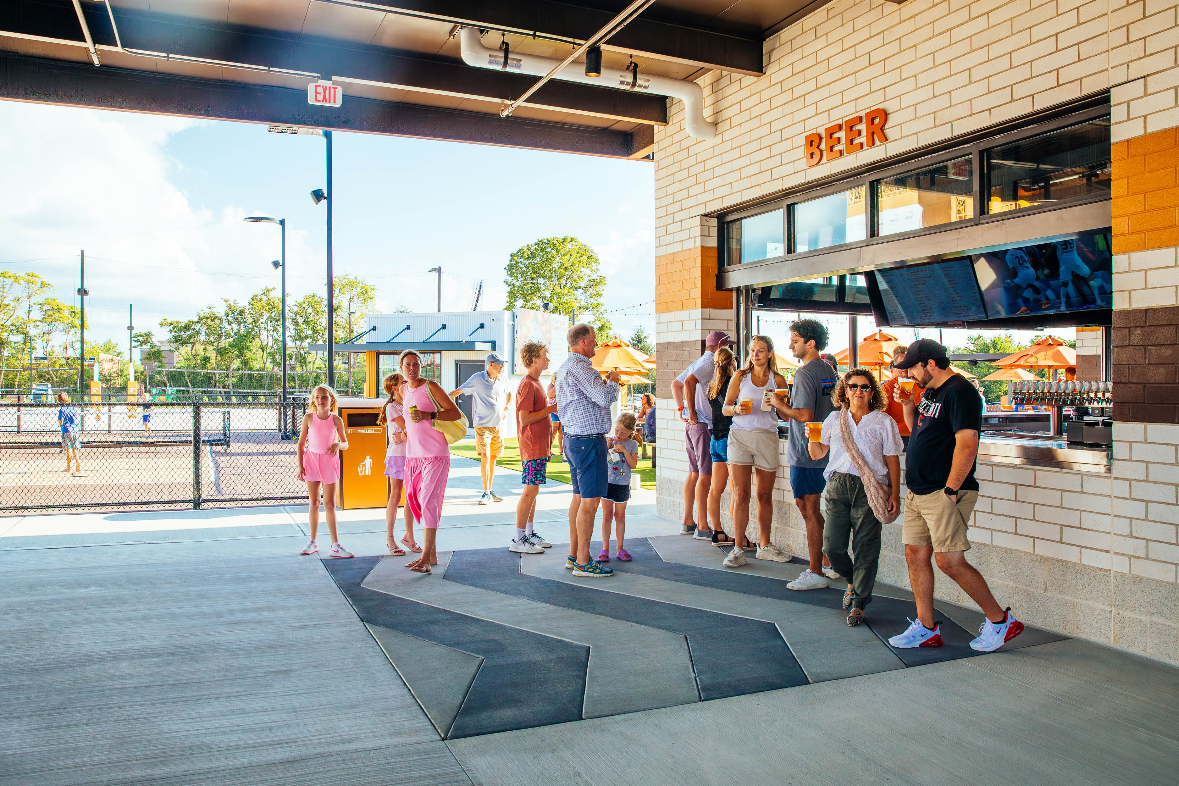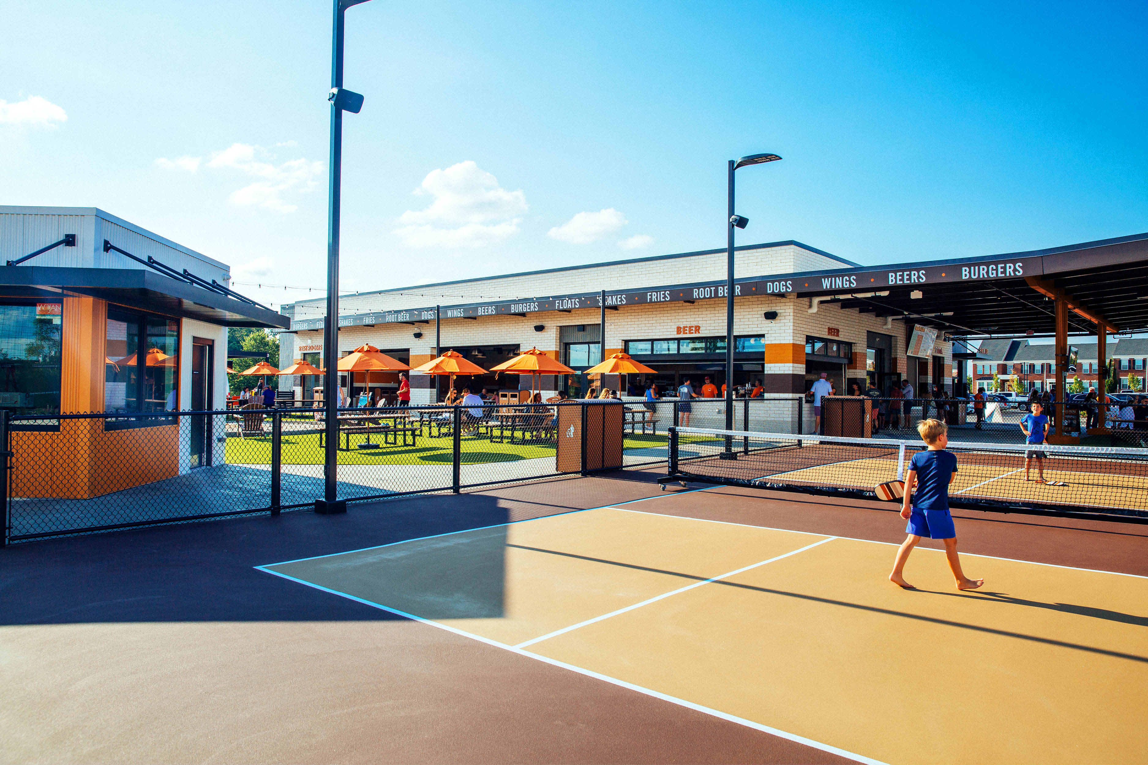 Fifty West's design is equally committed to fostering social connection. Community-focused spaces, like volleyball and pickleball courts, encourage active participation and interaction. The flexible seating arrangements—whether it’s long communal tables for groups or cozy four-top setups—provide the perfect environment for both large gatherings and intimate moments. This design isn’t just about aesthetics; it’s about encouraging people to come together, have fun, and make memories.