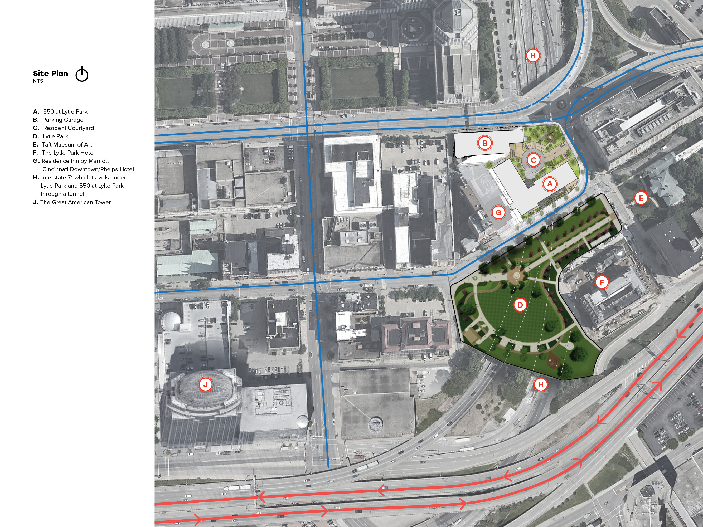 The renovation of 550 E. 4th Street in downtown Cincinnati reimagines a brick Brutalist mid-century building into a luxurious residential community. With a focus on refined and timeless elegance, the project revitalized this apartment building through facade improvements, a new entry sequence, architectural upgrades, site rework, and a complete overhaul on the interior to elevate units and upgrade amenities.