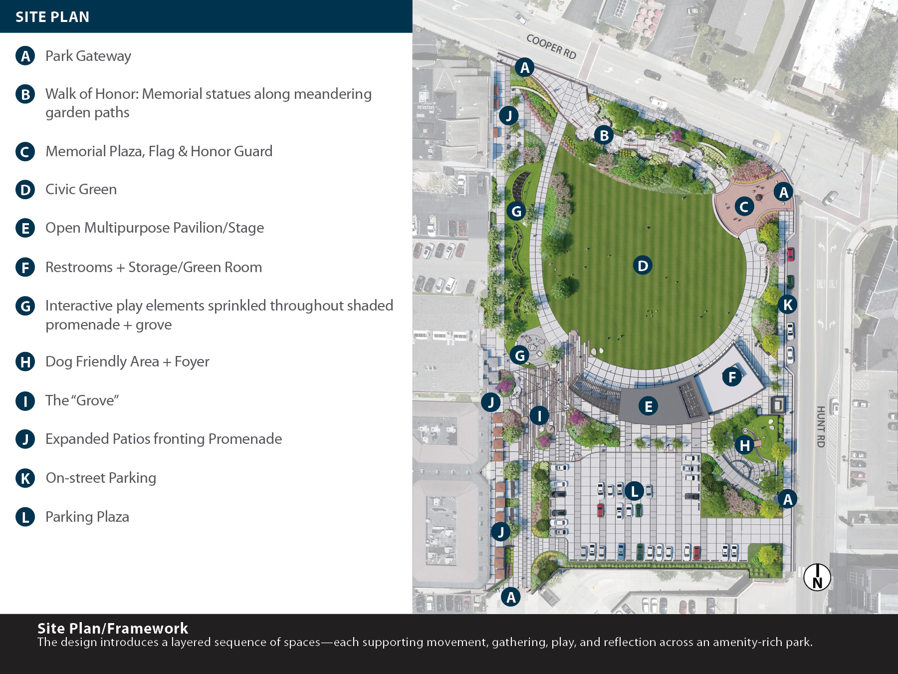• The Civic Green + Pavilion form the beating heart—a flexible lawn framed by a prominent pavilion supporting events, performances, and everyday respite.