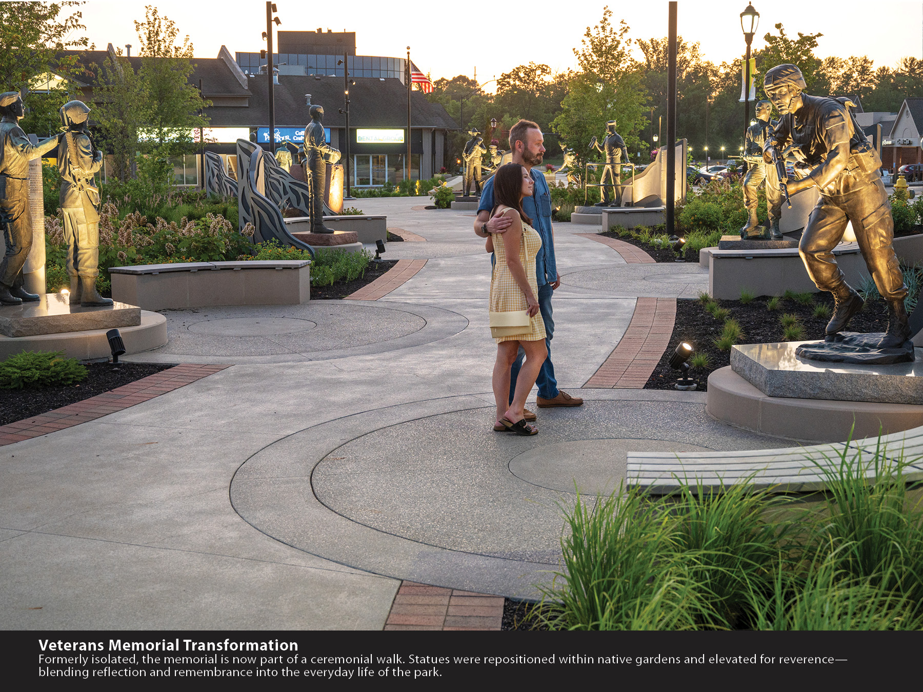 The transformation is profound. Once isolated and static, it now forms a ceremonial procession—anchored by existing monuments re-sited along a contemplative path surrounded by layered plantings. This dignified setting honors service while inviting reflection as part of the park experience.