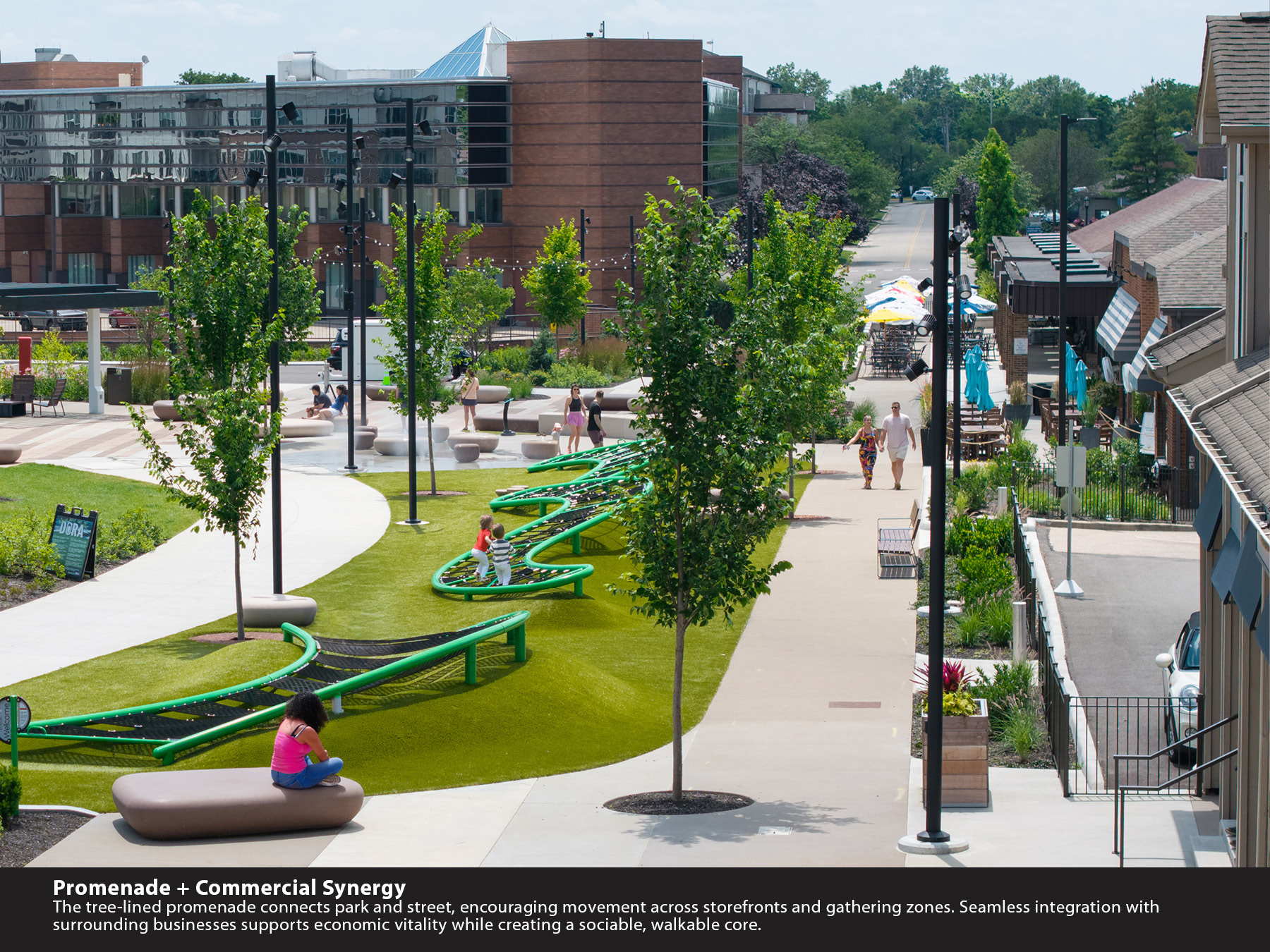 • The Promenade stitches park and storefronts, creating a tree-lined pedestrian corridor activating businesses and encouraging social interaction.