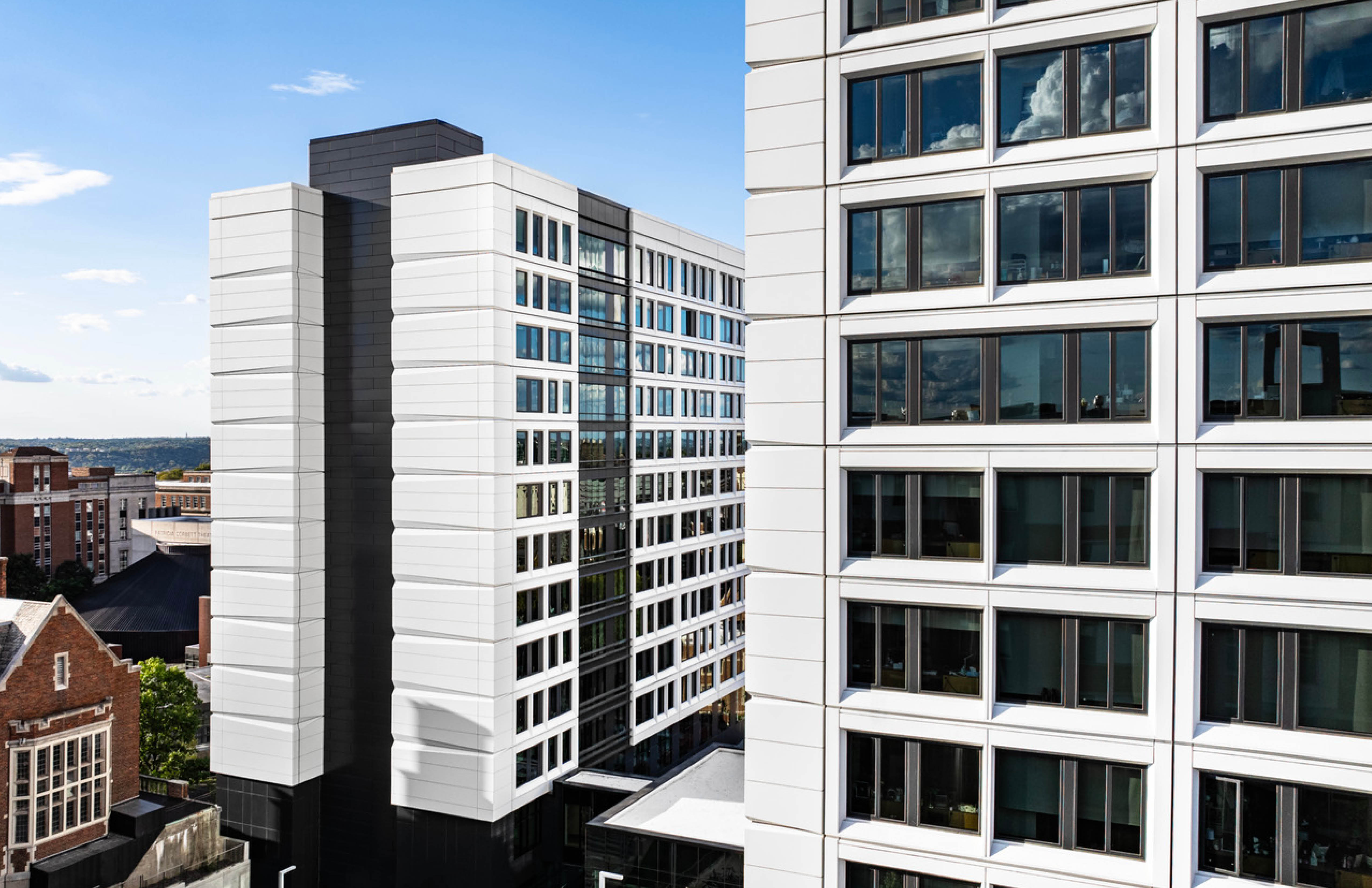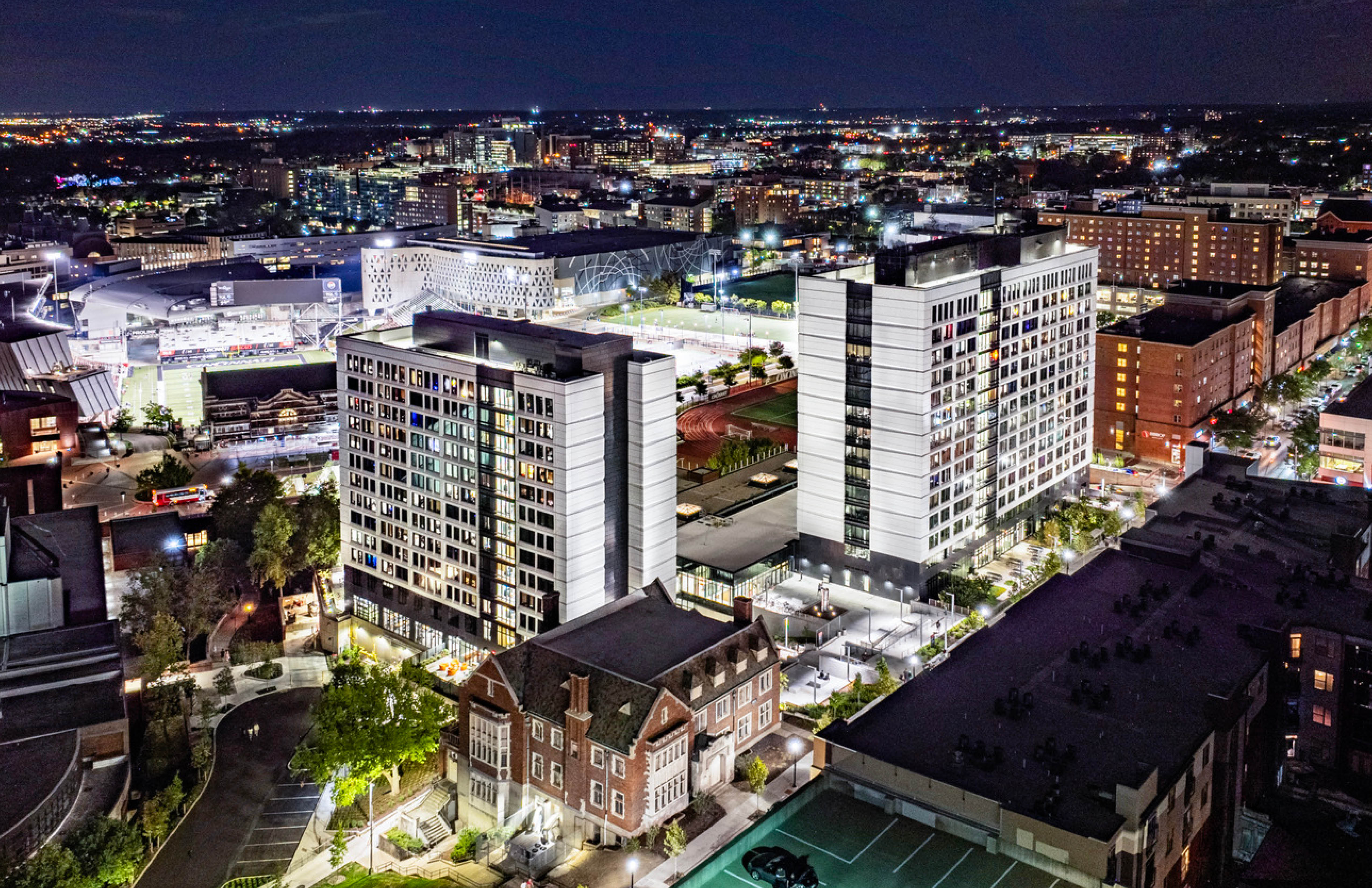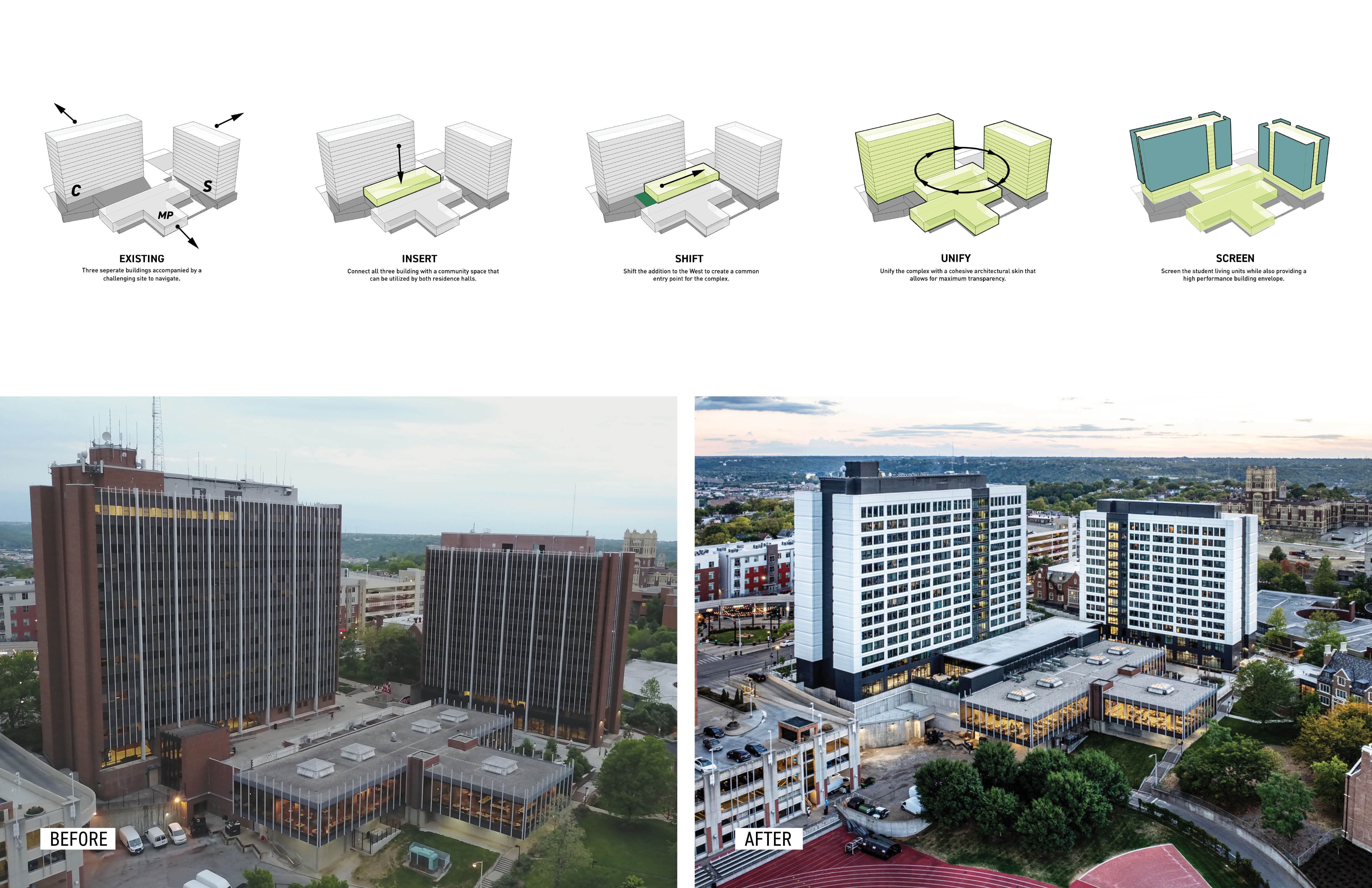 Situated on the southern edge of UC's bustling Uptown Campus, the Calhoun and Siddall Hall complex stands as a vital entry point for students and visitors. The renovation of the complex encompassed comprehensive upgrades, ranging from additional community space to room enhancements to public outdoor spaces to a complete transformation of the exterior building facades.