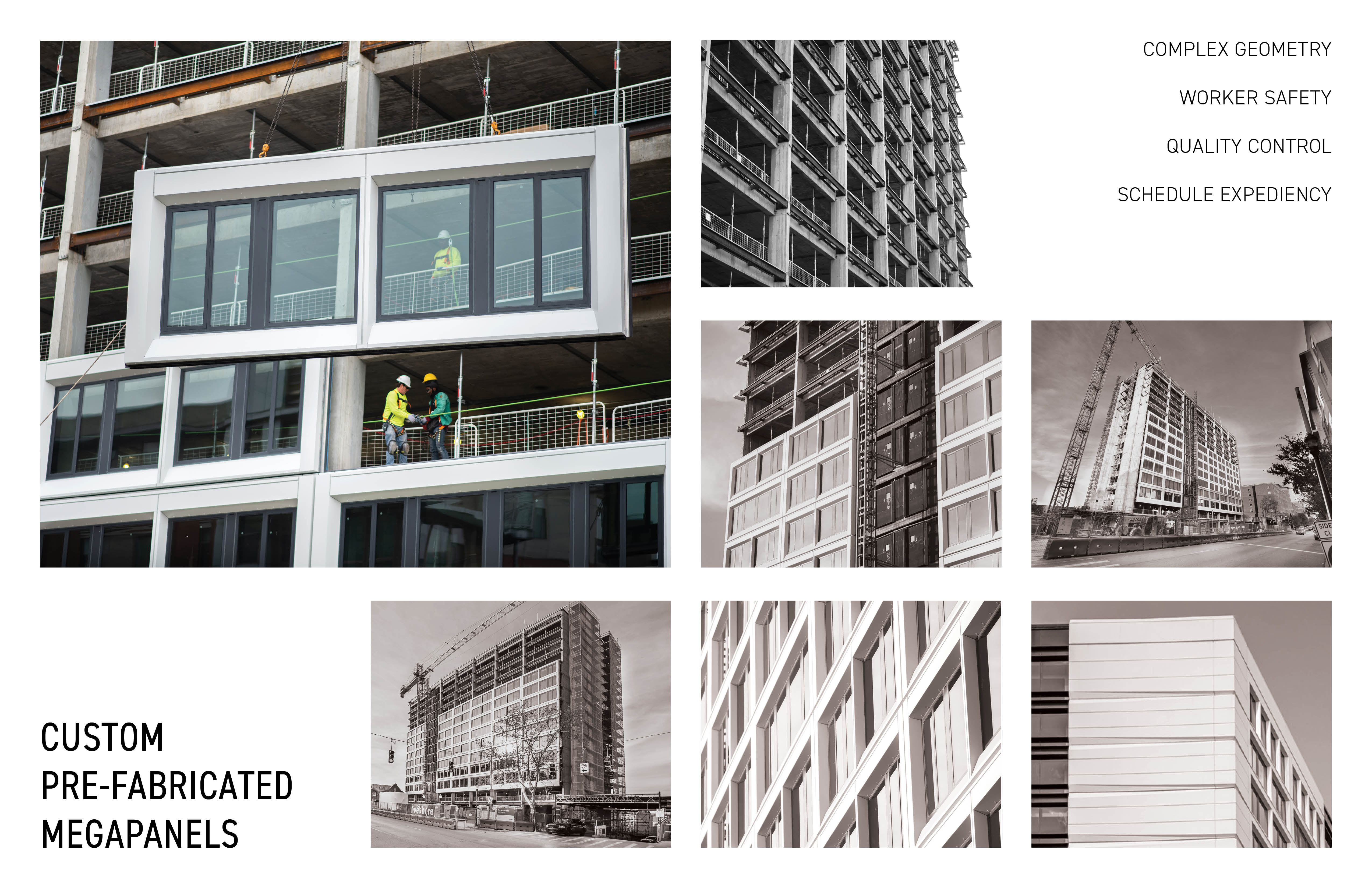 The hallmark of the renovations lies in the innovative approach to the façades — a premanufactured, custom mega panel assembly measuring one floor high by one structural bay wide (10’ x 24’). To meet the challenges of a confined site and an accelerated schedule, the facade was meticulously crafted off-site under controlled conditions. Panels were then transported and seamlessly integrated into the structure, eliminating the need for extensive on-site staging. Exterior work and fall protection measures became redundant resulting in a swiftly erected, weather-tight enclosure with minimal field joints, achieving an efficient, high performing building envelope.