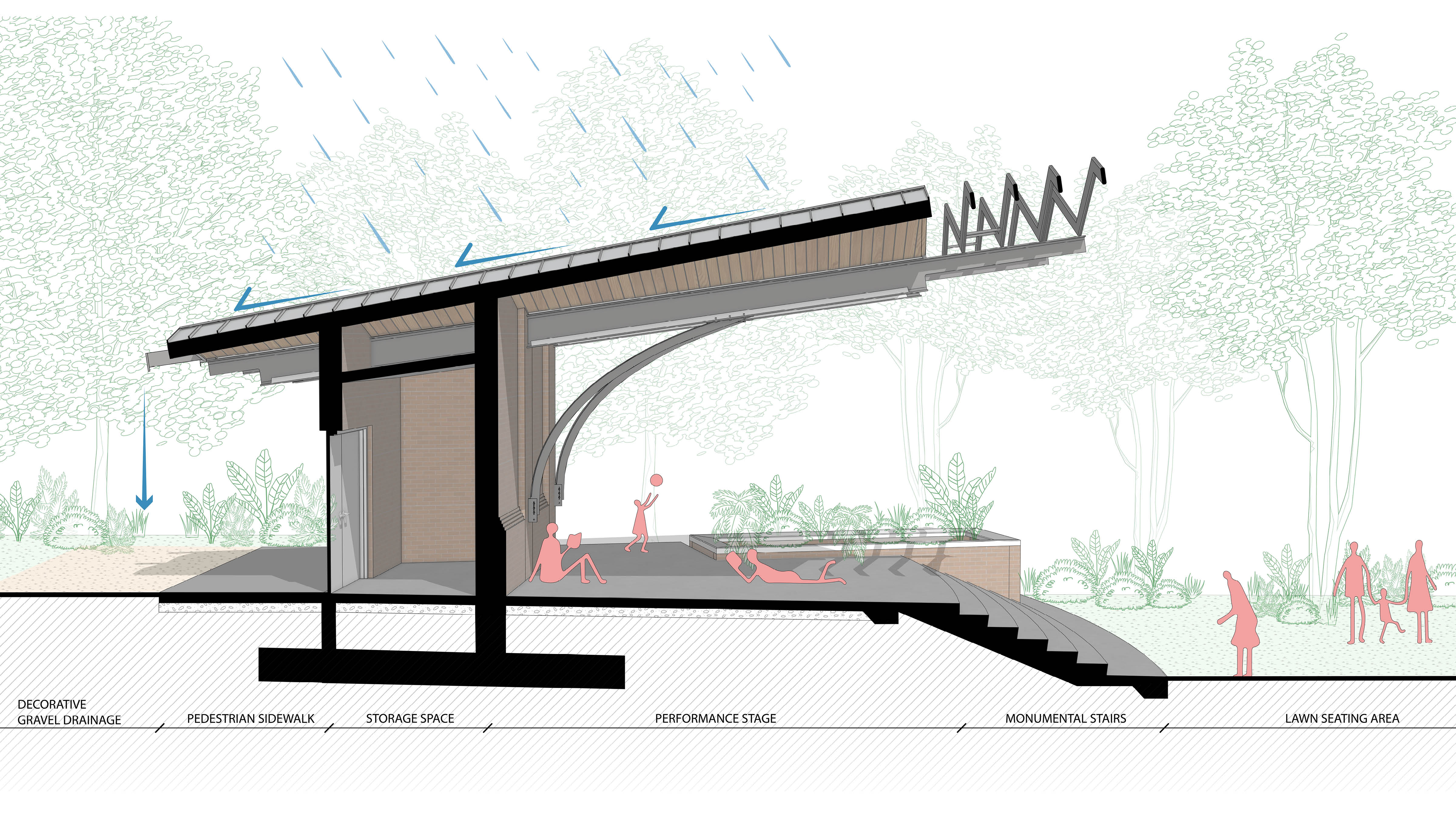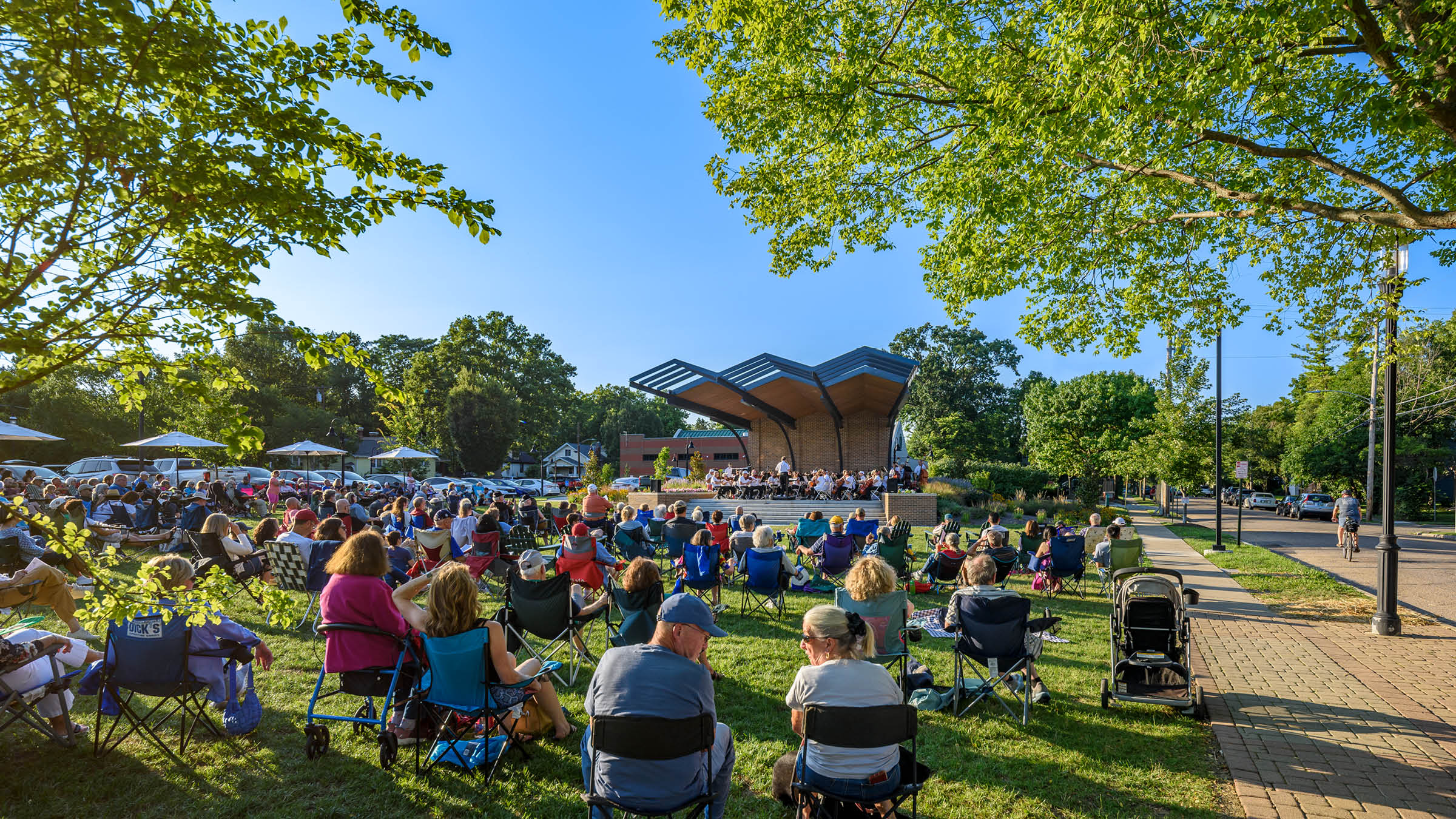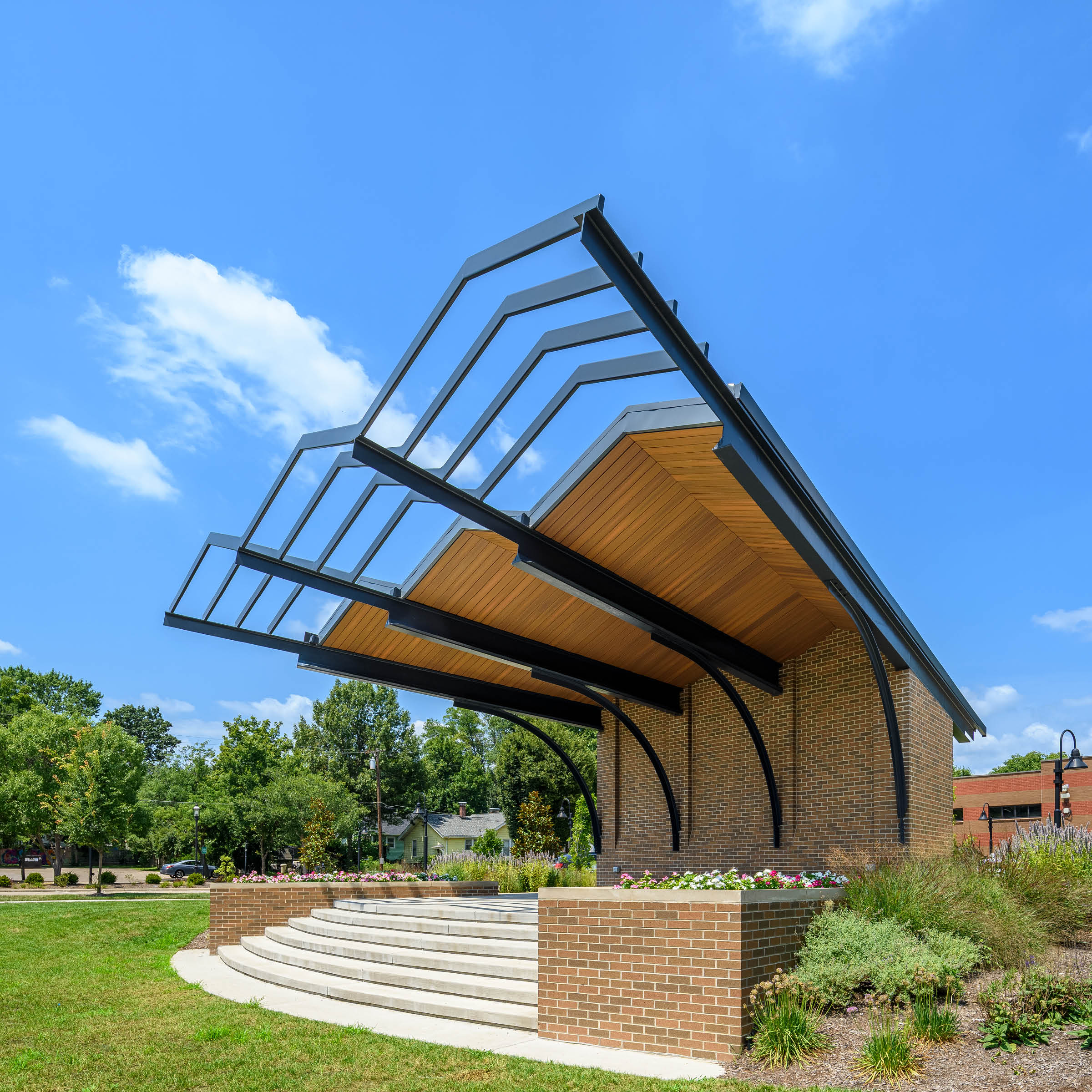 To address this, the City of Wyoming and the Wyoming Community Foundation launched a community-driven planning effort in 2020 to reimagine the park and pavilion, ensuring the project reflected both tradition and future aspirations. The new pavilion echoes Wyoming’s historic train station, once a gateway to Cincinnati and symbol of the city’s suburban identity. Designed as a civic landmark, it honors that legacy of connection by providing a welcoming cultural space for gathering and celebration, extending Wyoming’s tradition of blending history, community, and civic life. The design team collaborated with community leadership, refining the performance pavilion architecture to best reflect Wyoming’s history, neighborhood character, and shared community values.
