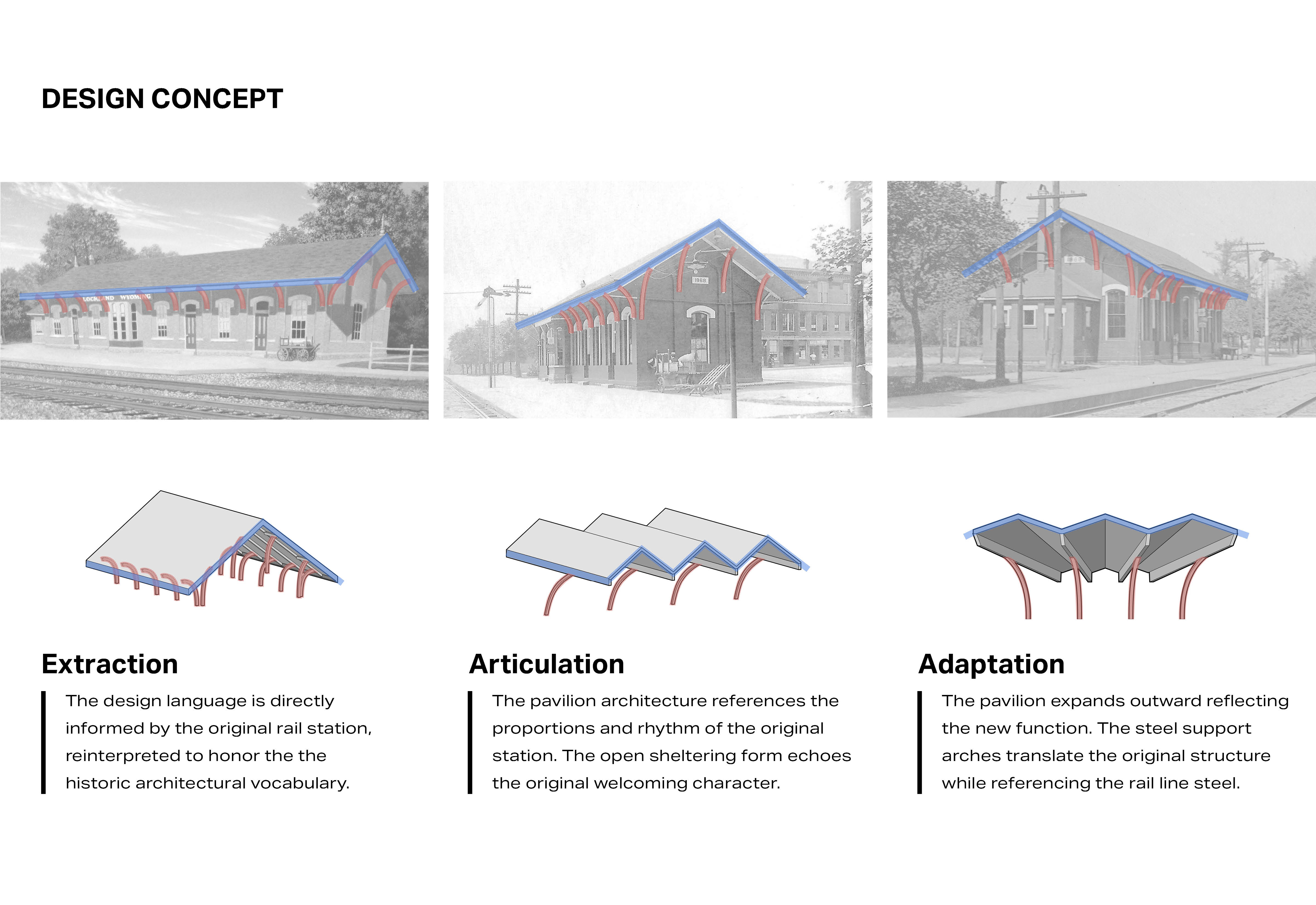 The pavilion’s design serves as the park’s new focal point, drawing from the historic rail station, then reinterpreting its forms, proportions, and details into a contemporary civic landmark. By translating the station’s material choices, structure and crafted character, the pavilion carries forward the railroad legacy while adapting a flexible setting for public performances, community gatherings, and everyday use. The Village Green performance pavilion captures the spirit of connection once fostered by the train station into a modern moment of cultural and civic life.