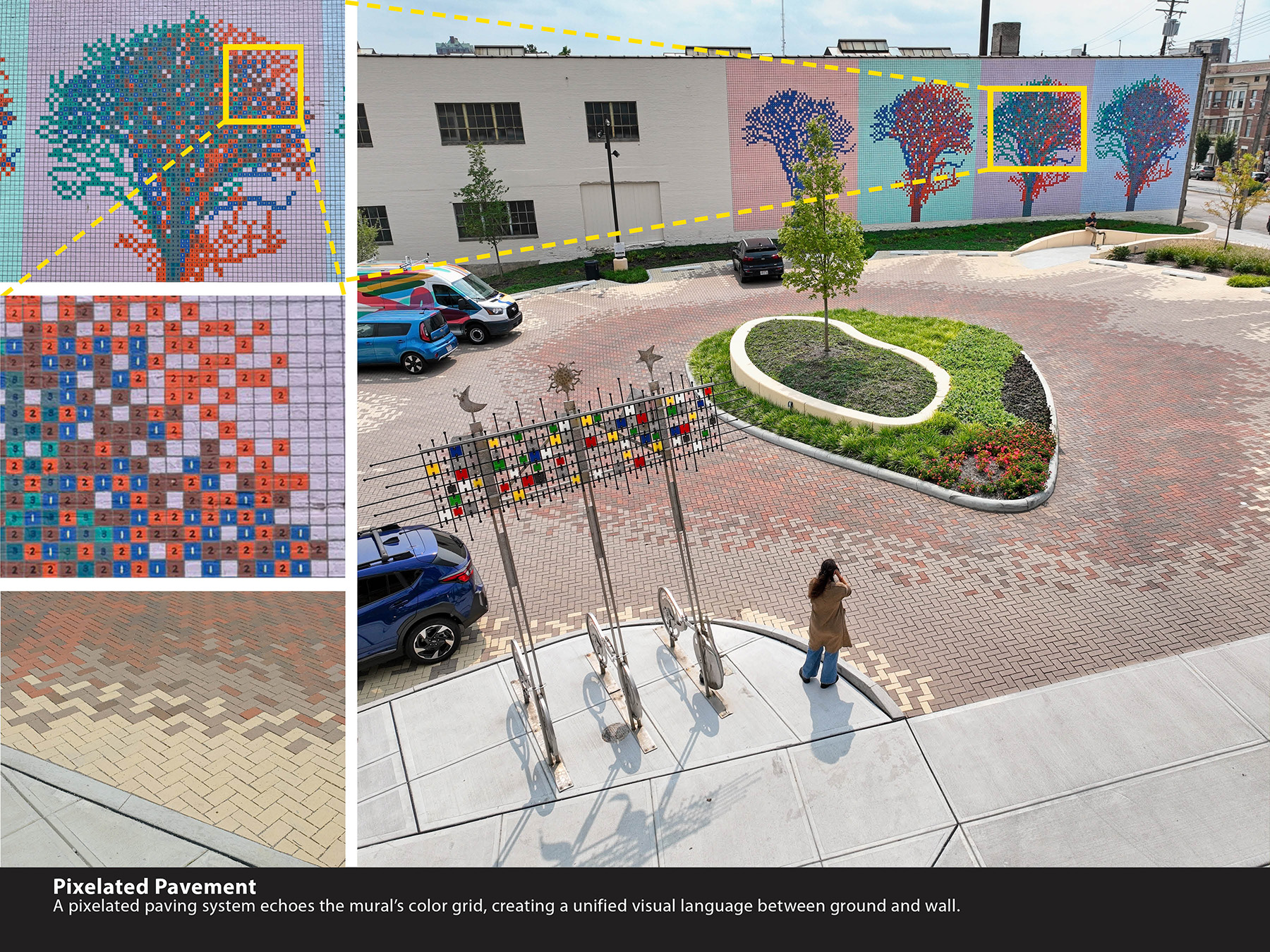 Situated at the convergence of cultural investment and neighborhood momentum, the ArtPark serves as both a functional amenity and a public landmark. A stormwater management requirement became an artistic opportunity. Inspired by the adjacent mural’s pixelated, paint-by-number trees, permeable pavers form a patterned ground plane that echoes the mural’s geometry—visually and conceptually linking the surface and the wall. Drone imagery was used to ensure construction precisely matched the design intent, reinforcing the ArtPark’s identity as a living artwork.