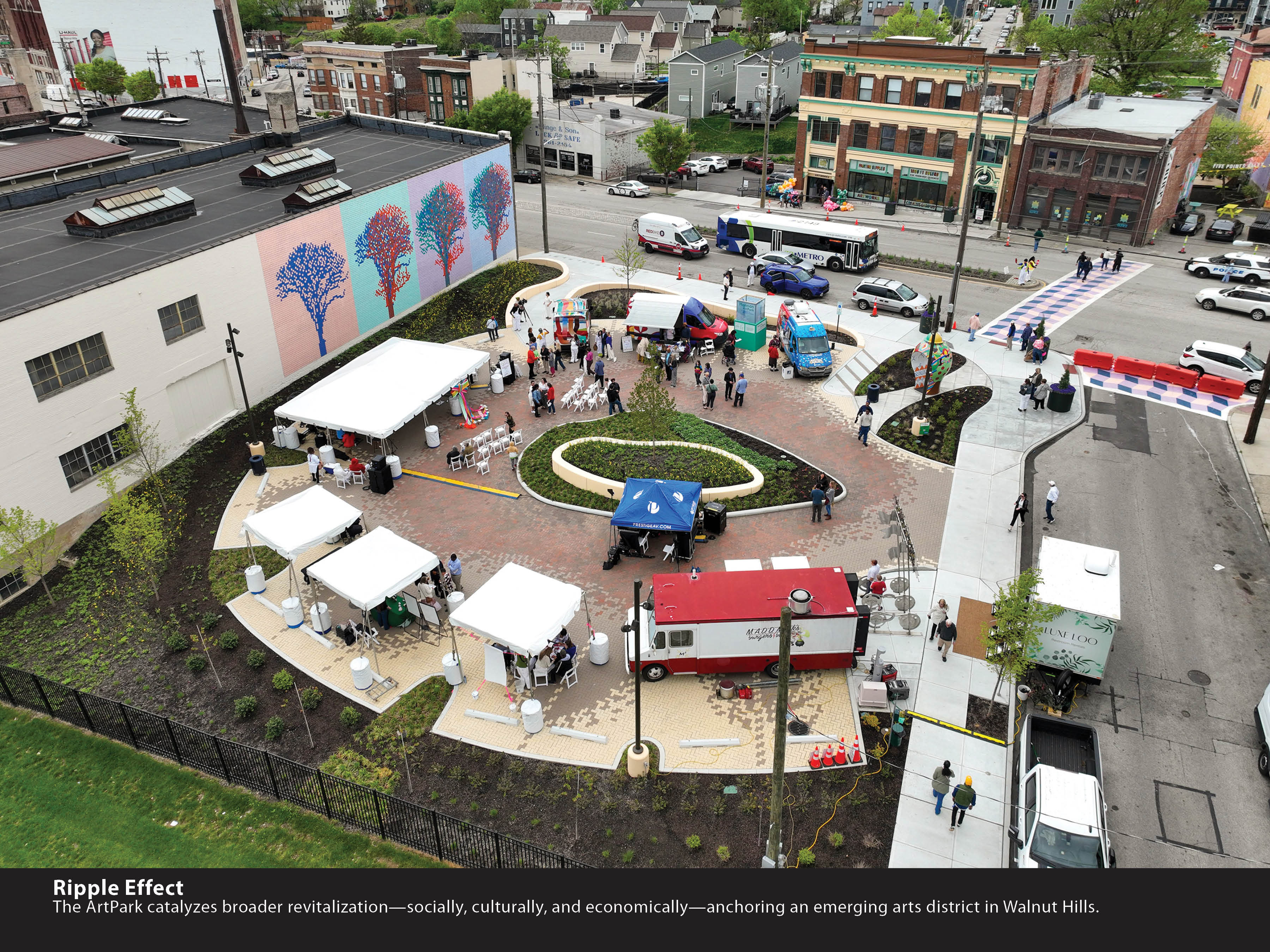 Today, the Hannan ArtPark anchors a growing arts corridor that stretches from the Cincinnati Art Museum to Walnut Hills. It is used as a place to gather, celebrate, reflect, and create. It repositions infrastructure as civic gesture, reinvents a vacant lot as a cultural node, and demonstrates how even the most utilitarian land uses can uplift a neighborhood.