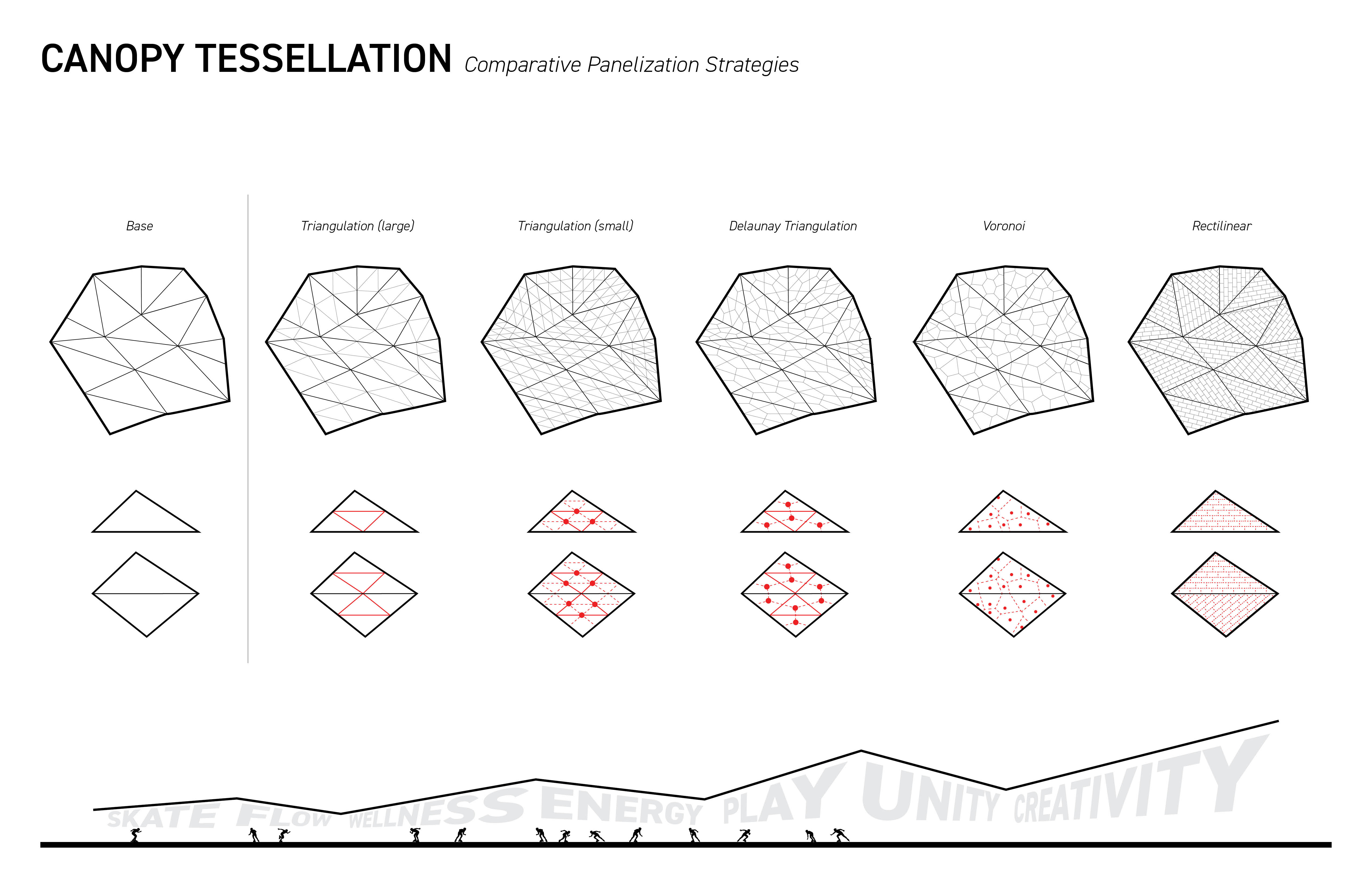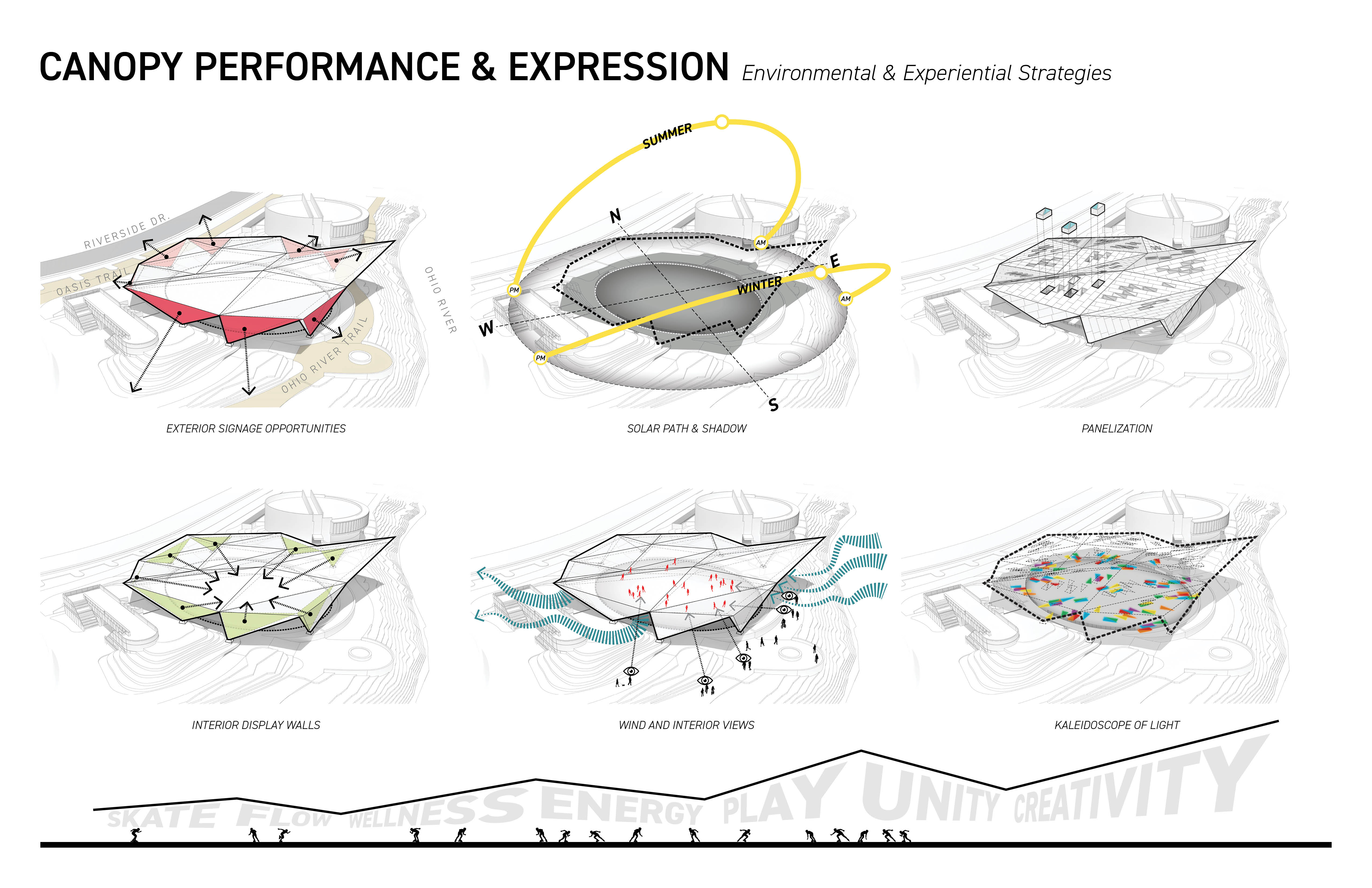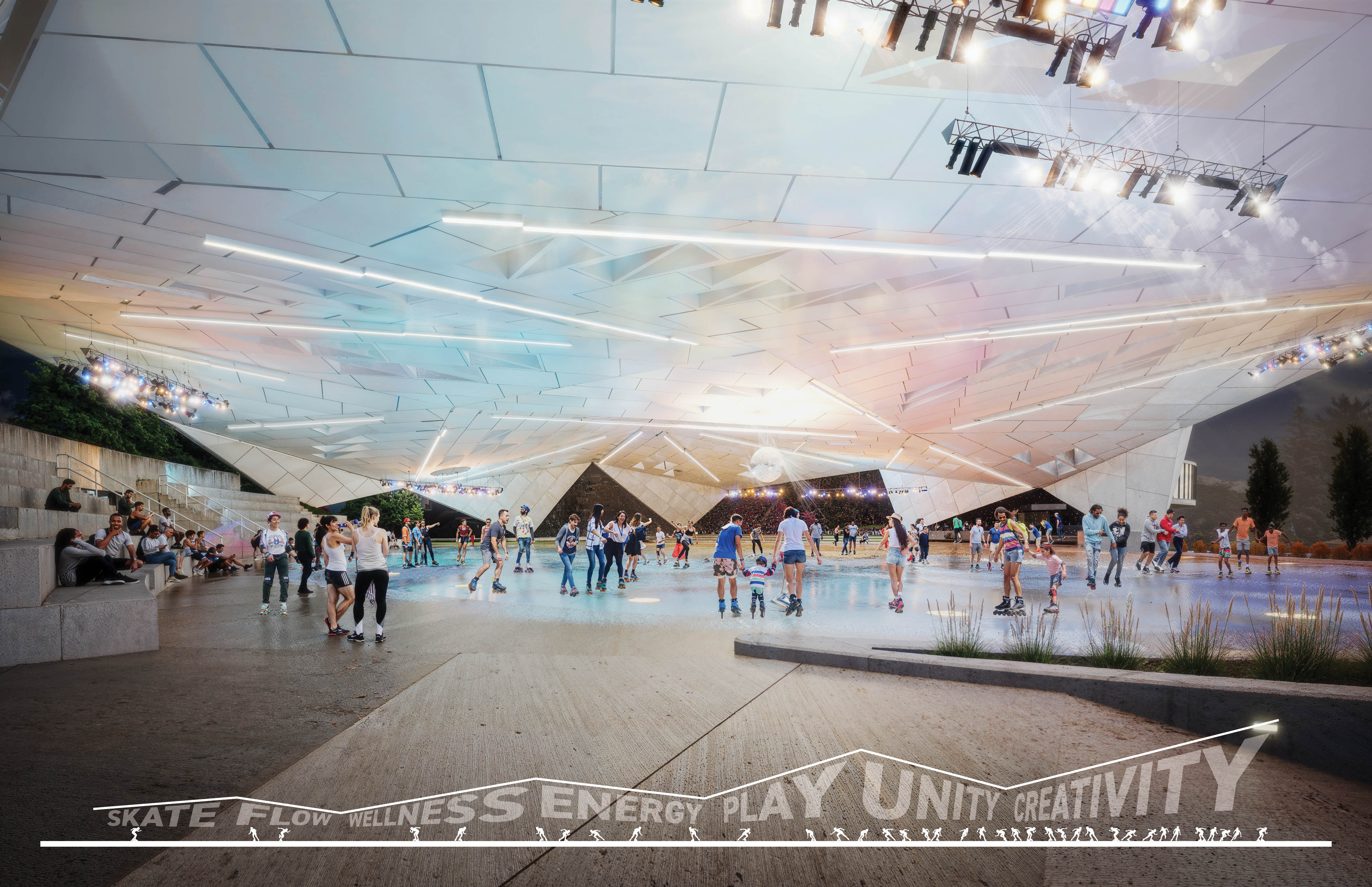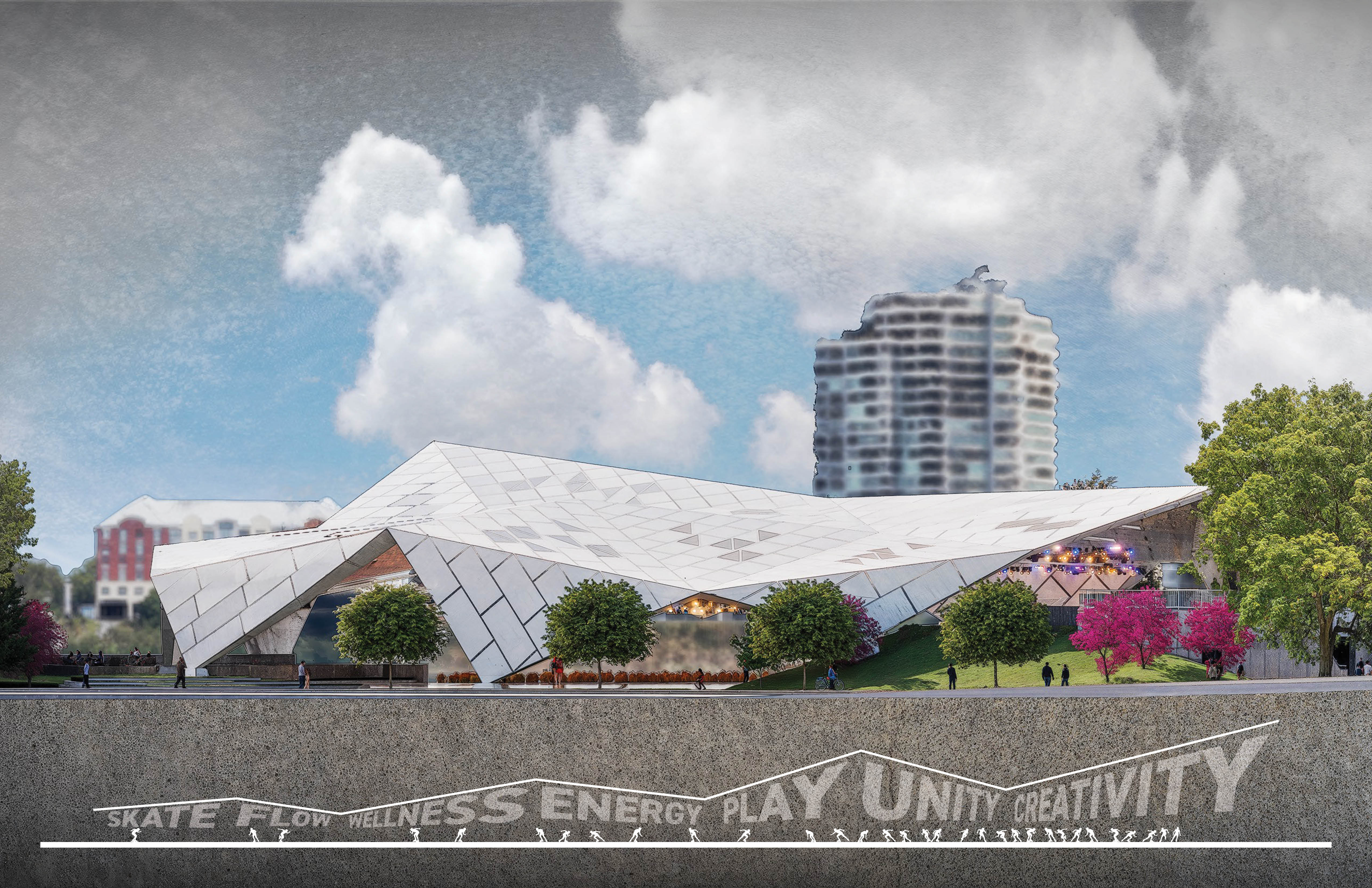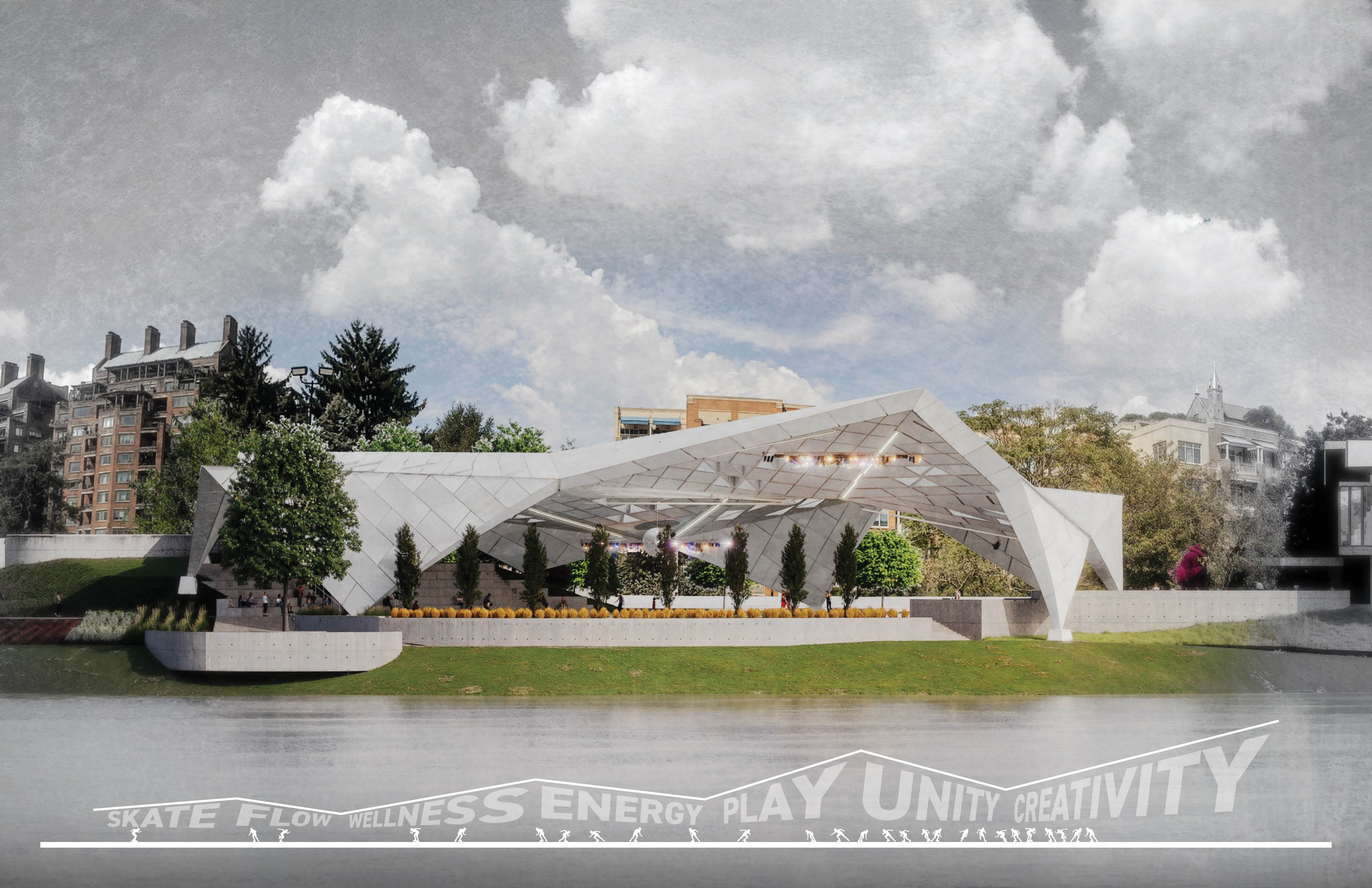In 1988, the Sawyer Point Roller Rink opened as part of the transformation of Sawyer Point Riverfront Park. Since that time, the roller rink saw only sporadic use until a dramatic resurgence with the creation of Skate Cincinnati, whose purpose is to bring the culture of roller skating back to the urban environment. The current rink is one of the largest waterfront rinks in the United States, measuring four times the size of a standard roller rink. However, the ability to use the facility during unpredictable weather has become a significant challenge, as Skate Cincinnati’s planned events have no guarantee of suitable conditions. The dream of Skate Cincinnati is to create an open-air, covered rink that responds to environmental challenges while enhancing the riverfront as an iconic landmark that highlights roller skating as a meaningful community and cultural statement. Historically, roller rinks—and the skaters who frequented them—were deeply embedded in the African American community during the Civil Rights Movement. These spaces served as hubs for artistic expression, social connection, and personal freedom. The design challenge was to span the existing rink with a form that mirrors the energy of roller skating, while also unifying the walls and roof into one cohesive structure. The proposed design uses a series of linear structural beams supporting similar prefabricated panels, collectively forming a dome-like structure. This minimizes the number of vertical foundations required in the riverfront’s inconsistent soils. As the roof curves downward to form the walls, the structural members create triangular trusses, reinforcing the strength of the entire structure. Most prefabricated panels would be identical in size, but they could vary in transparency—ranging from solid to translucent or colored glass. Toward the river, the roof aperture opens to allow views of the water, while smaller openings at lower levels would channel prevailing winds to provide a natural breeze within the rink. Lightweight, angular metal panels would reflect sunlight, constantly shifting in appearance as the sun moves across the sky. It is Skate Cincinnati’s goal to fund this project in the future. Until then, it remains an aspiration for Cincinnati’s urban skating culture.