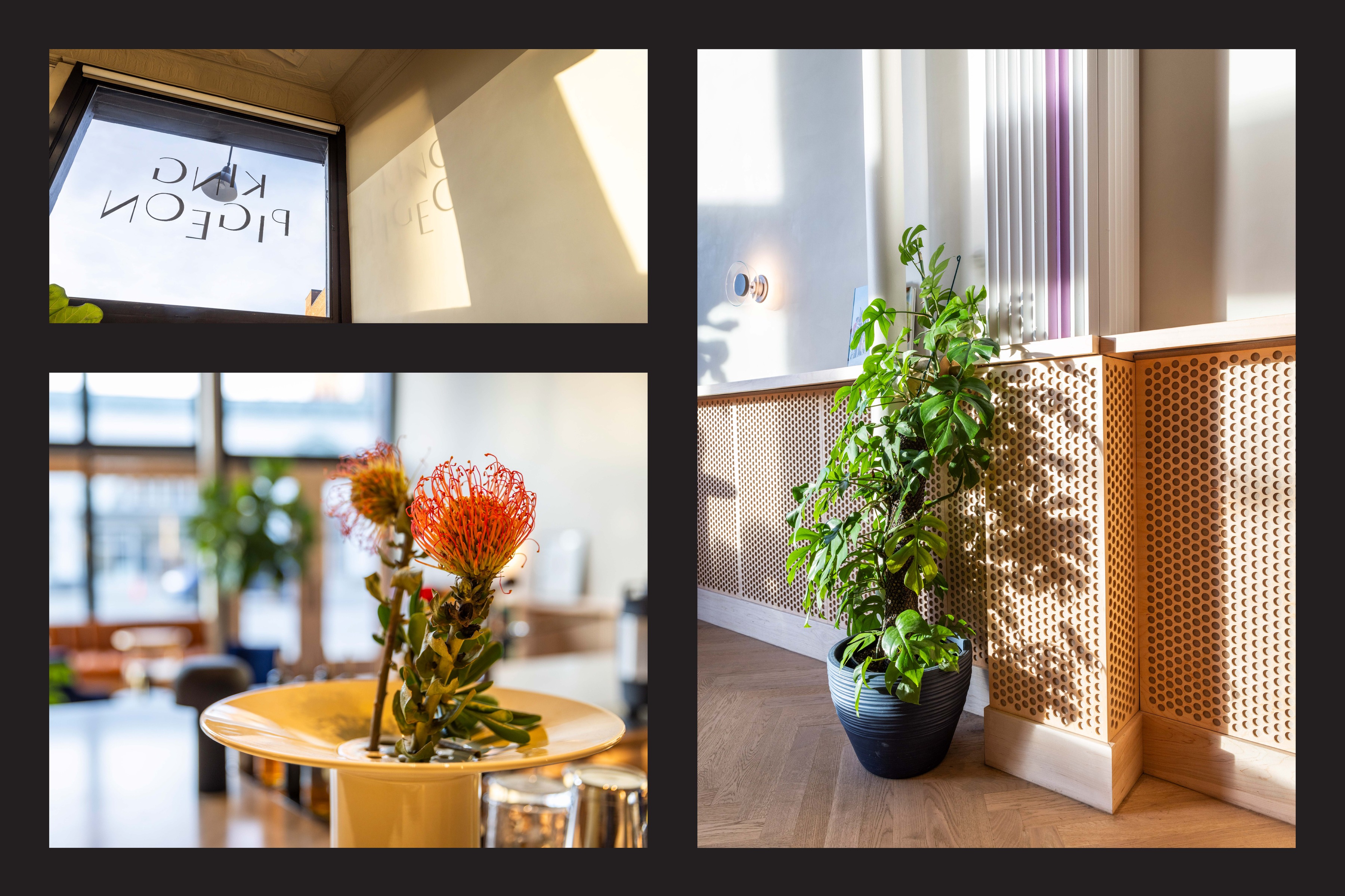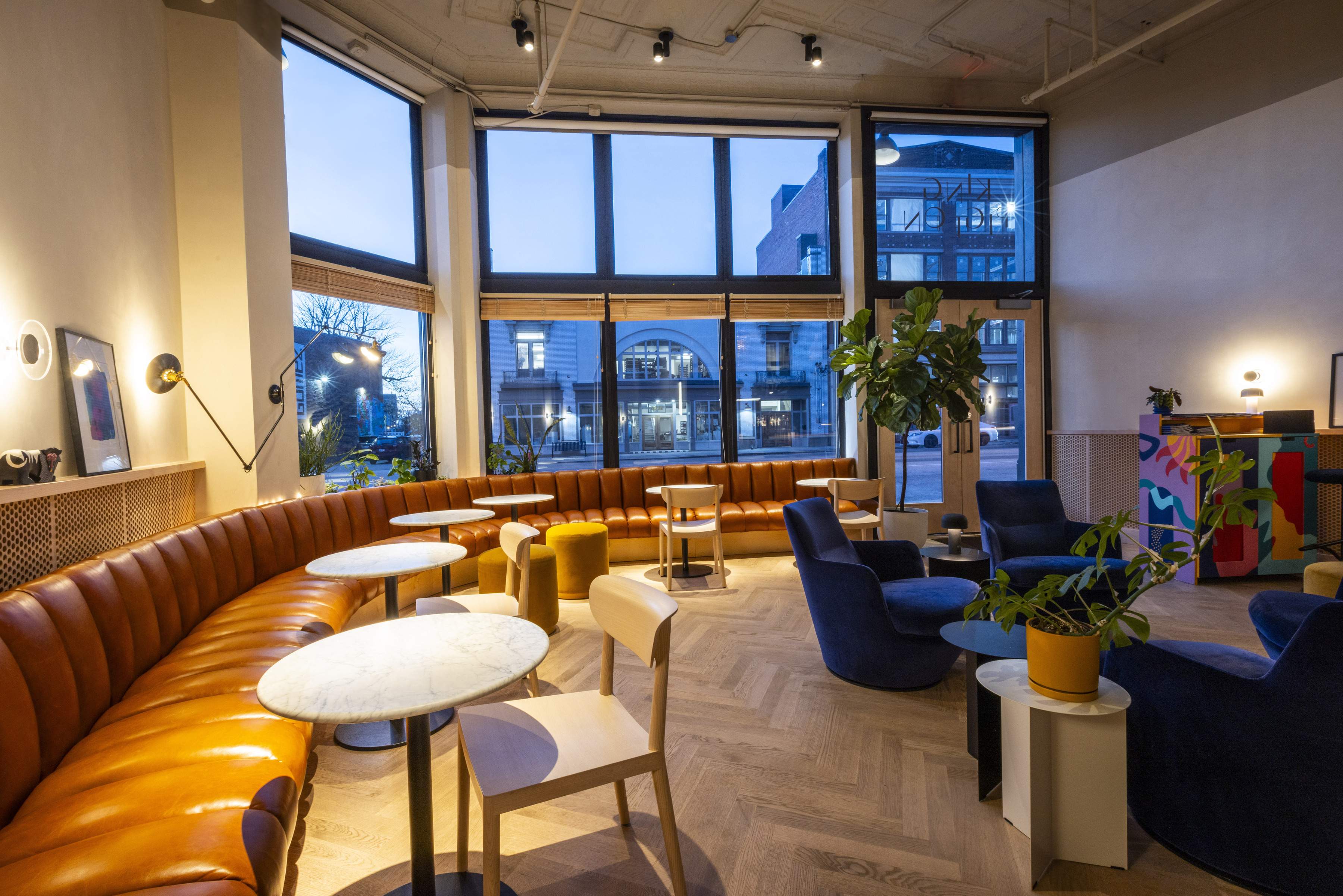Upon entering, guests are greeted by an unmistakable host stand adorned in a highly saturated graphic print. Adjacent to this focal point is a lounge area featuring mustard yellow side tables and custom velvet armchairs upholstered in King Pigeon’s signature cobalt blue, complemented by lush monstera plants that add a touch of greenery. A cognac leather channeled banquette encircles the remaining plan, its generous footprint peppered with tables for two — or one with a laptop.