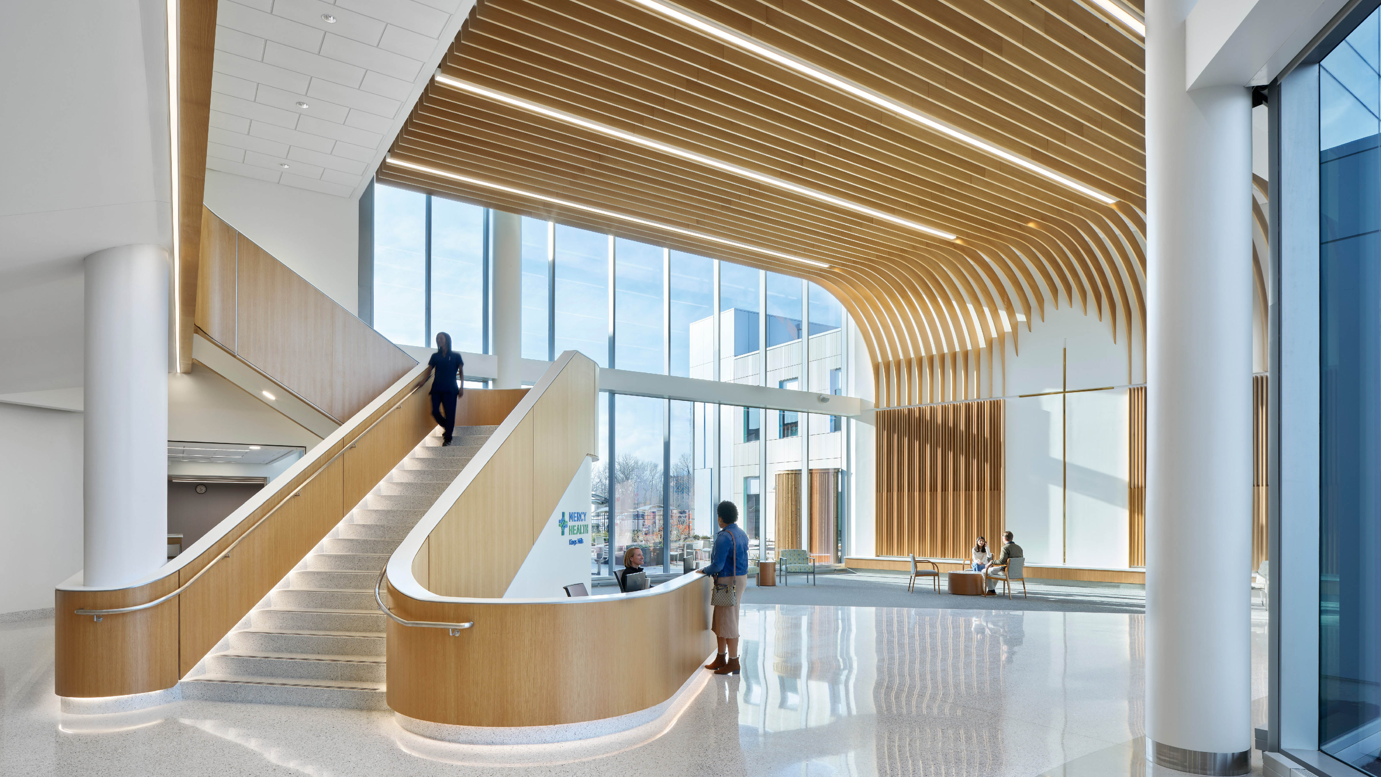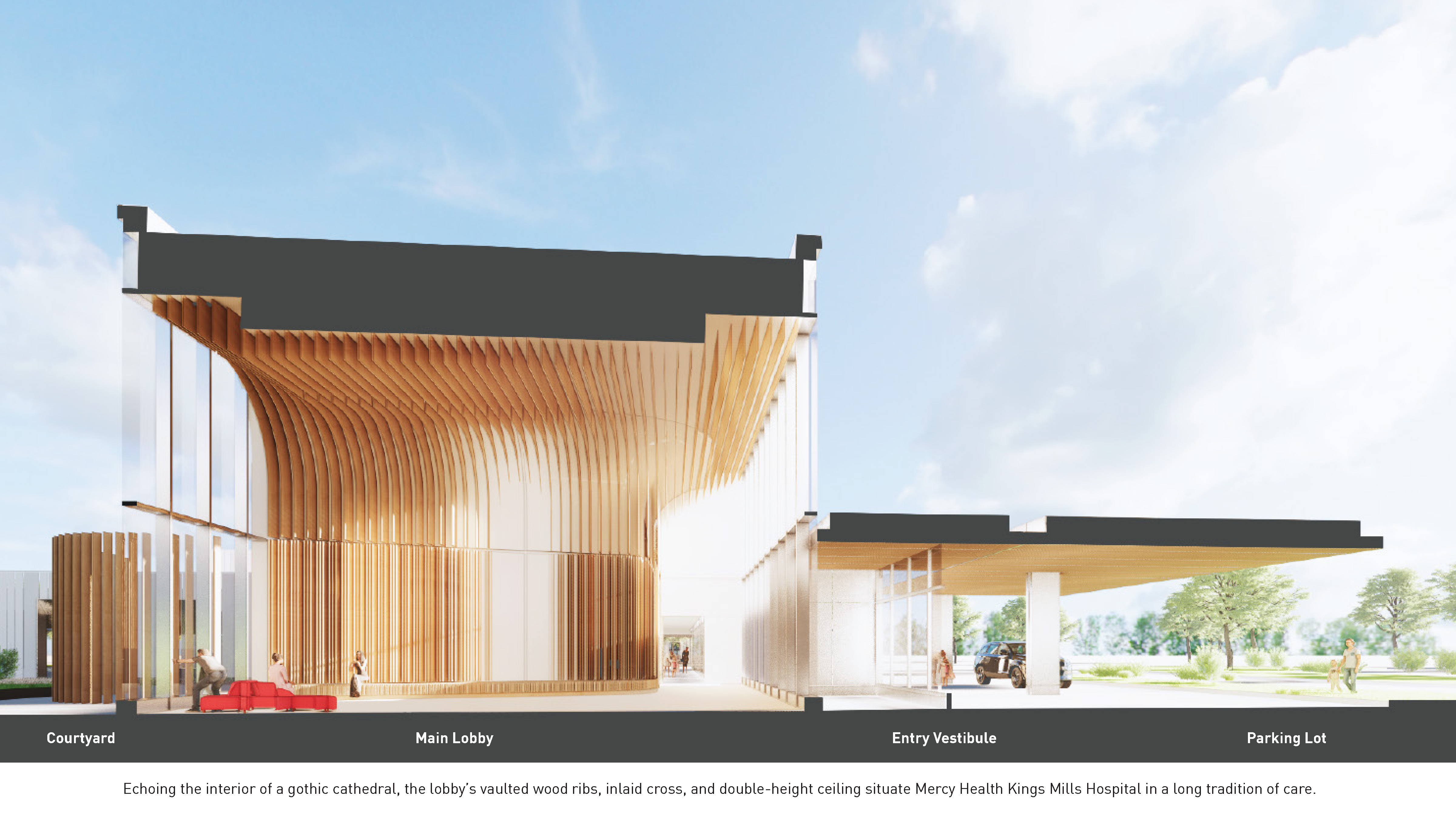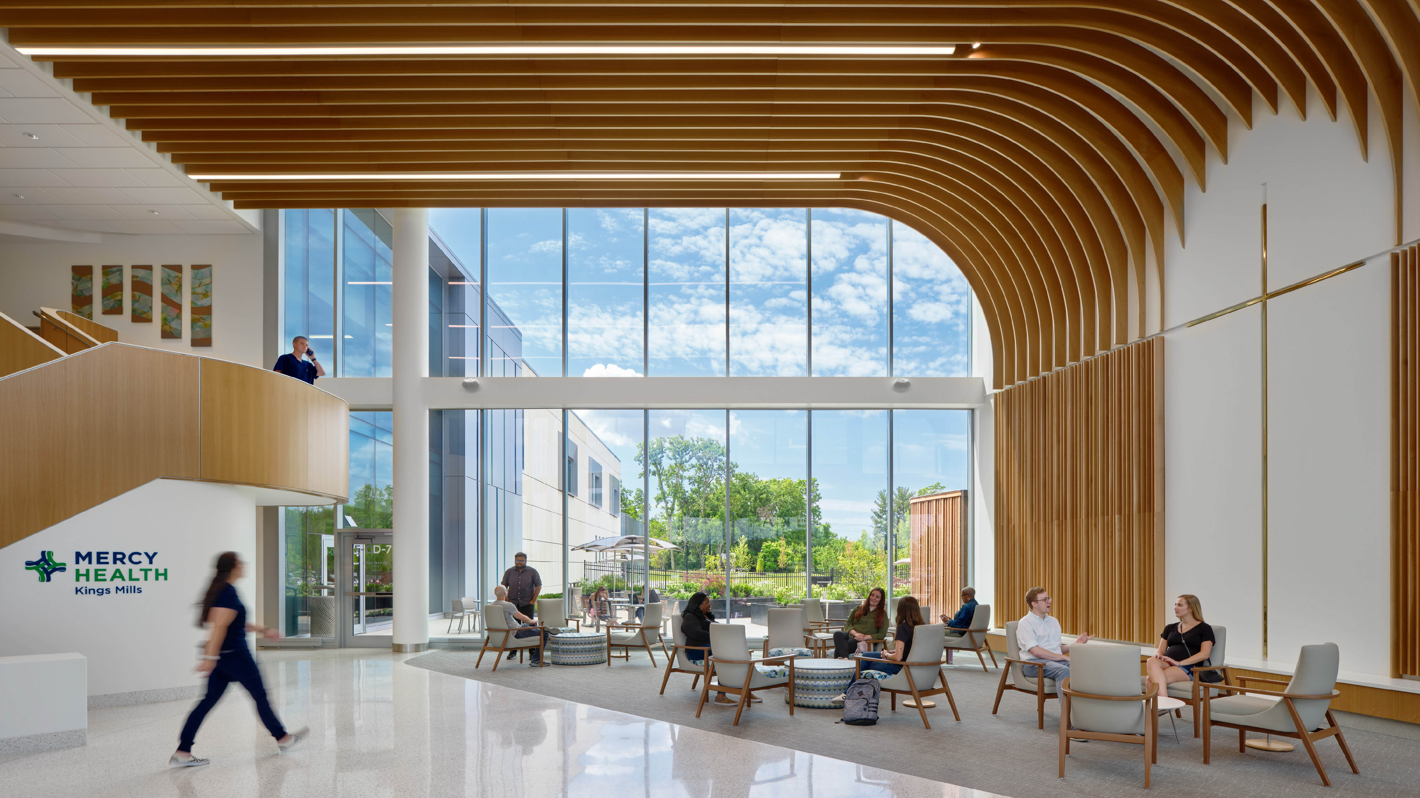 Mercy Health Kings Mills Hospital was built to meet the growing healthcare needs in northern Cincinnati's suburbs. The hospital combines a modern aesthetic with a compassionate atmosphere to alleviate patient anxiety. Clad in metal, reinforced concrete, and glass, the exterior reflects Mercy Health's tradition of care. Inside, a sunlit lobby welcomes visitors with vaulted wood ribs reminiscent of a gothic cathedral, fostering hope and faith. A sculptural wood staircase encourages movement and serves as a gathering space. The lobby connects to the hospital and medical office building, with a courtyard visible through a glass wall. A tranquil chapel, warmed by skylight-filtered light, offers solace nearby. Generous corridors lead patients through the building, filled with natural light and lounge areas. Wood details, like rounded panels and furniture, enhance warmth and comfort throughout key spaces. Kings Mills Hospital prioritizes patient well-being, providing a serene environment that supports healing and connection.