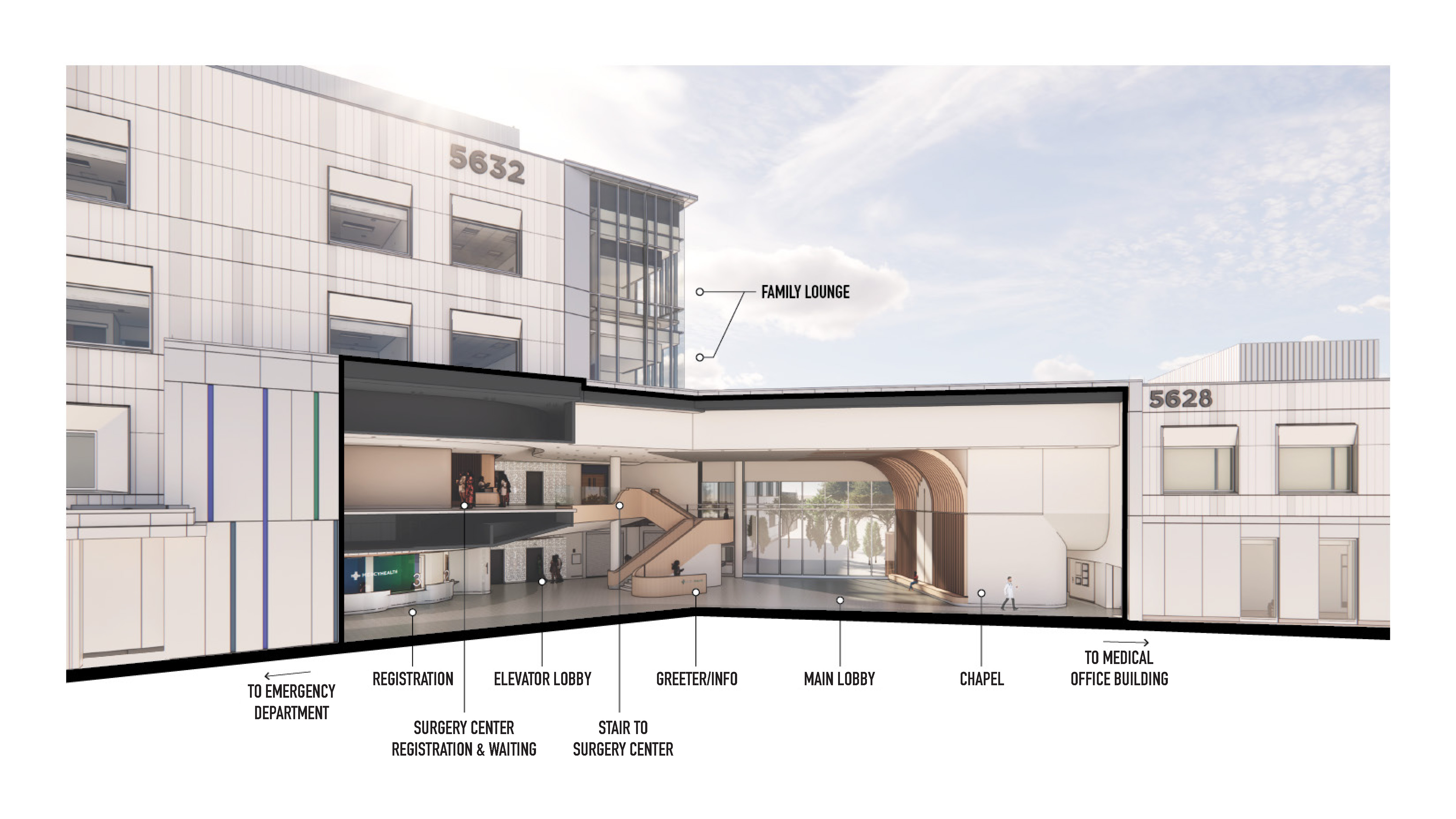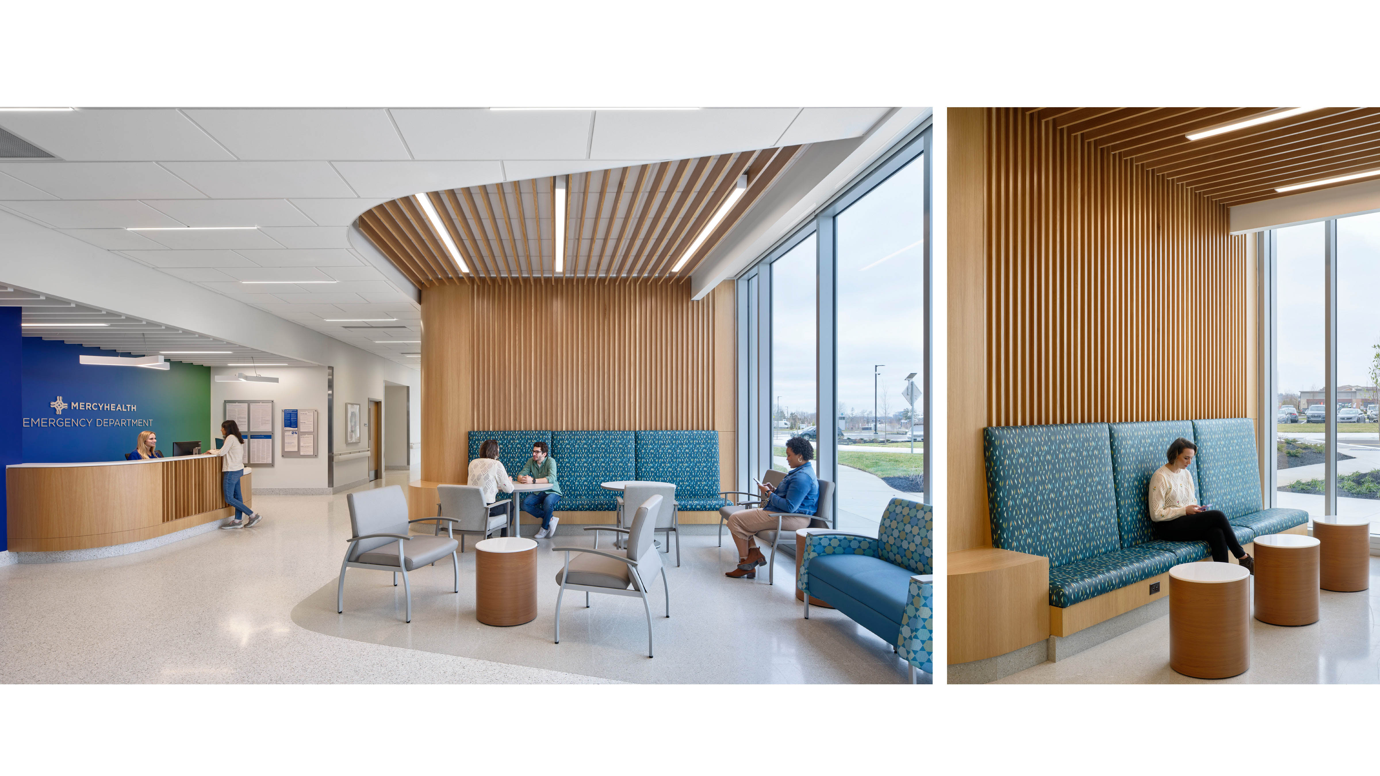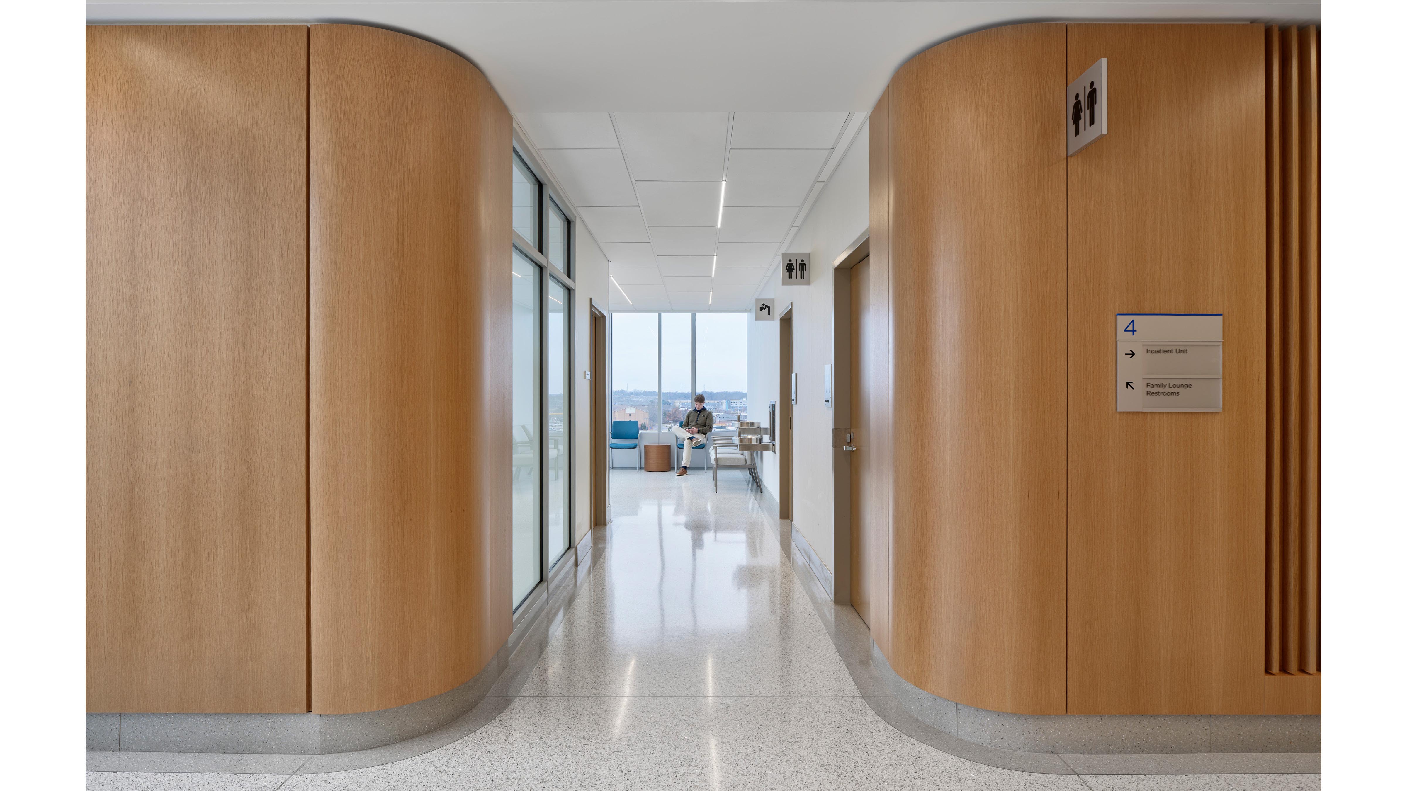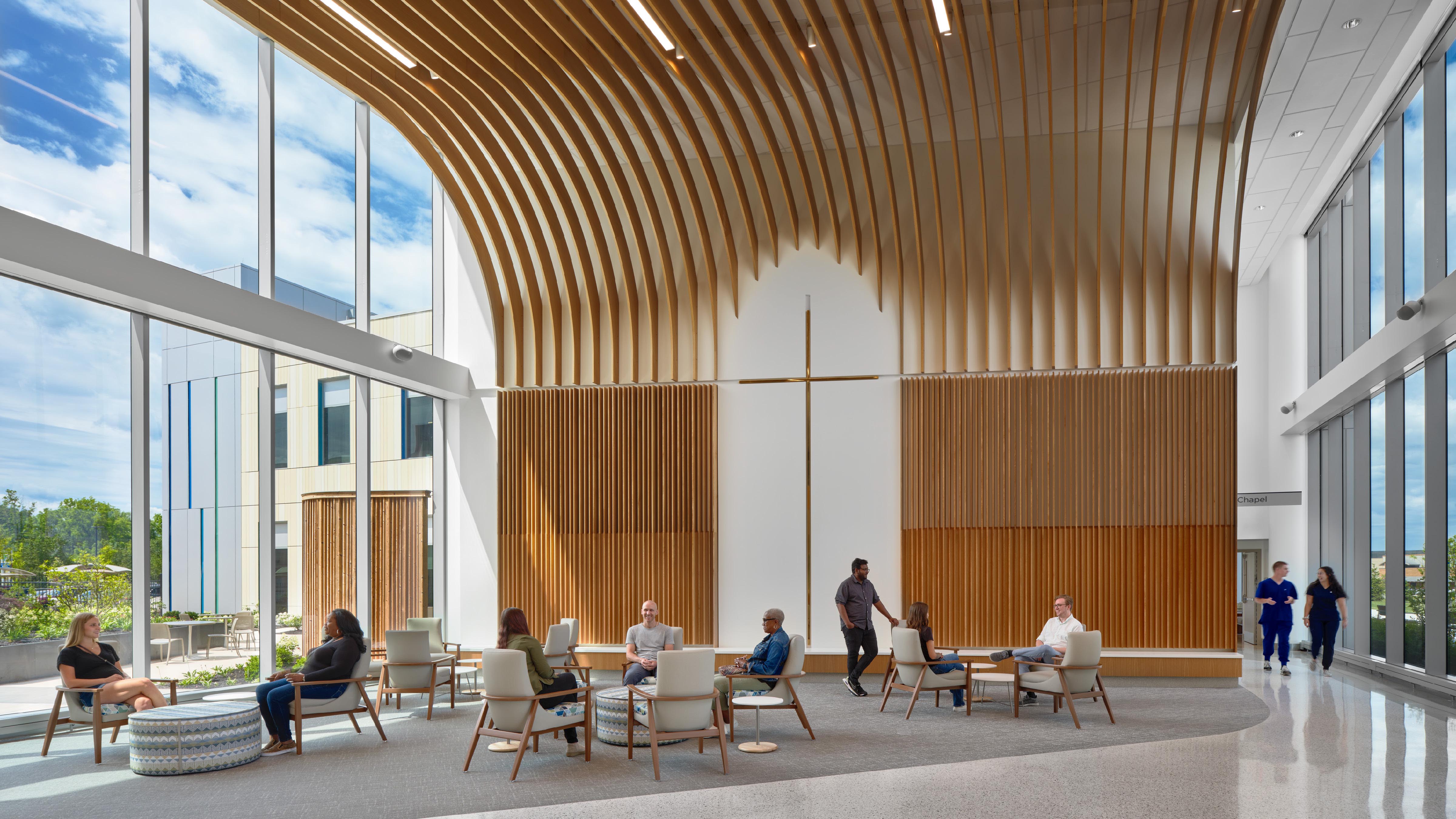 Mercy Health Kings Mills Hospital was built to meet the growing healthcare needs in northern Cincinnati's suburbs. The hospital combines a modern aesthetic with a compassionate atmosphere to alleviate patient anxiety. Clad in metal, reinforced concrete, and glass, the exterior reflects Mercy Health's tradition of care. Inside, a sunlit lobby welcomes visitors with vaulted wood ribs reminiscent of a gothic cathedral, fostering hope and faith. A sculptural wood staircase encourages movement and serves as a gathering space. The lobby connects to the hospital and medical office building, with a courtyard visible through a glass wall. A tranquil chapel, warmed by skylight-filtered light, offers solace nearby. Generous corridors lead patients through the building, filled with natural light and lounge areas. Wood details, like rounded panels and furniture, enhance warmth and comfort throughout key spaces. Kings Mills Hospital prioritizes patient well-being, providing a serene environment that supports healing and connection.