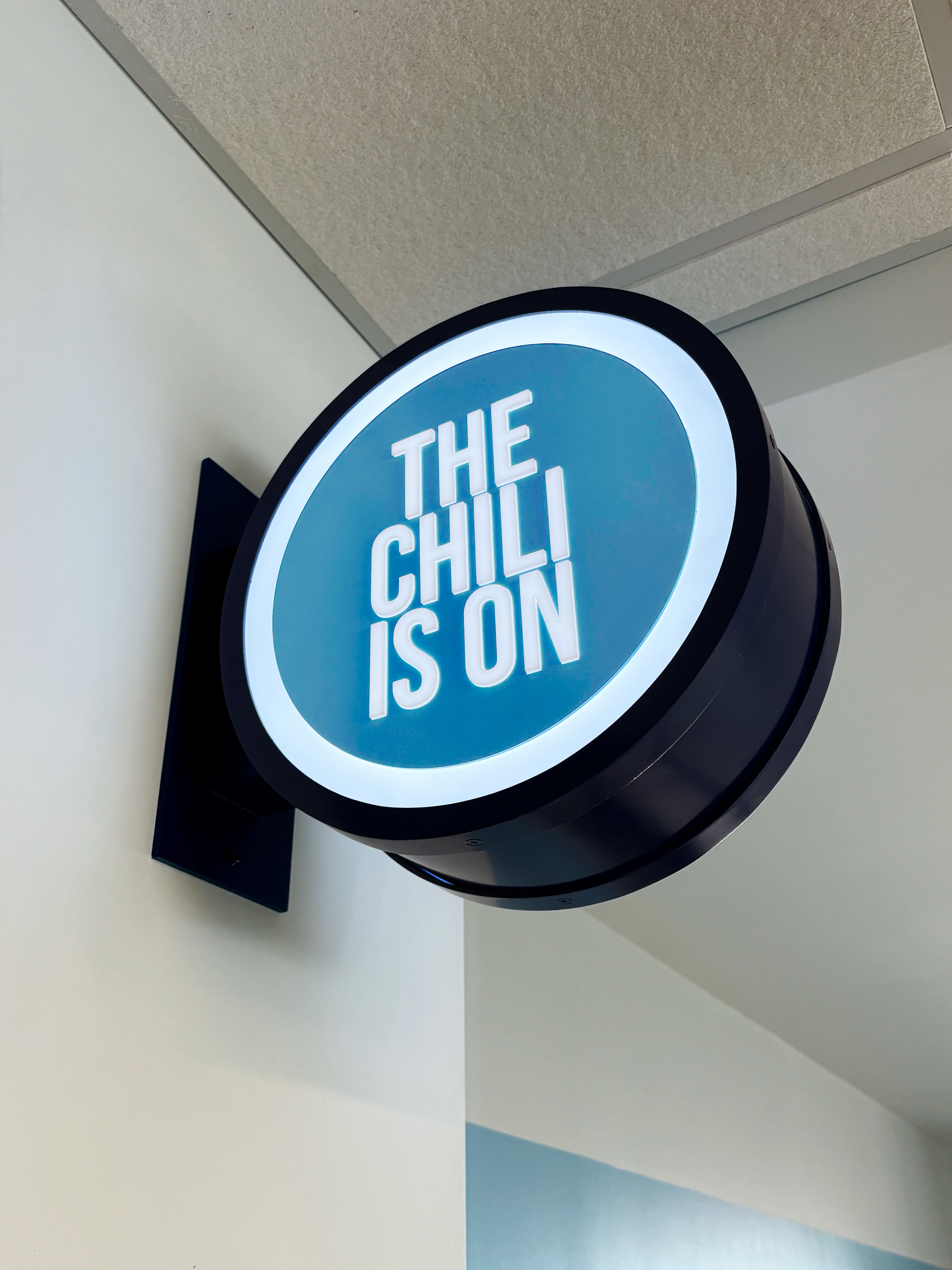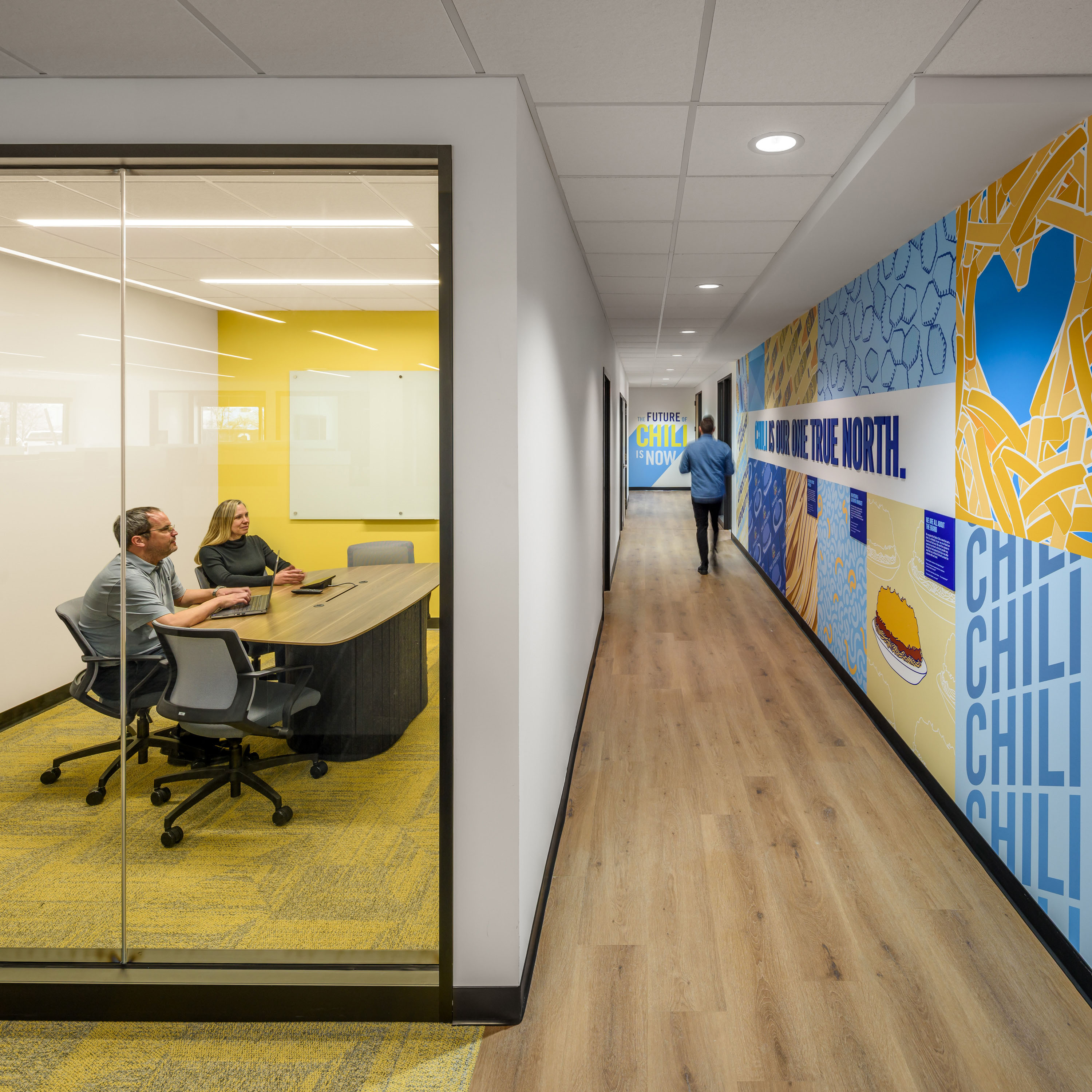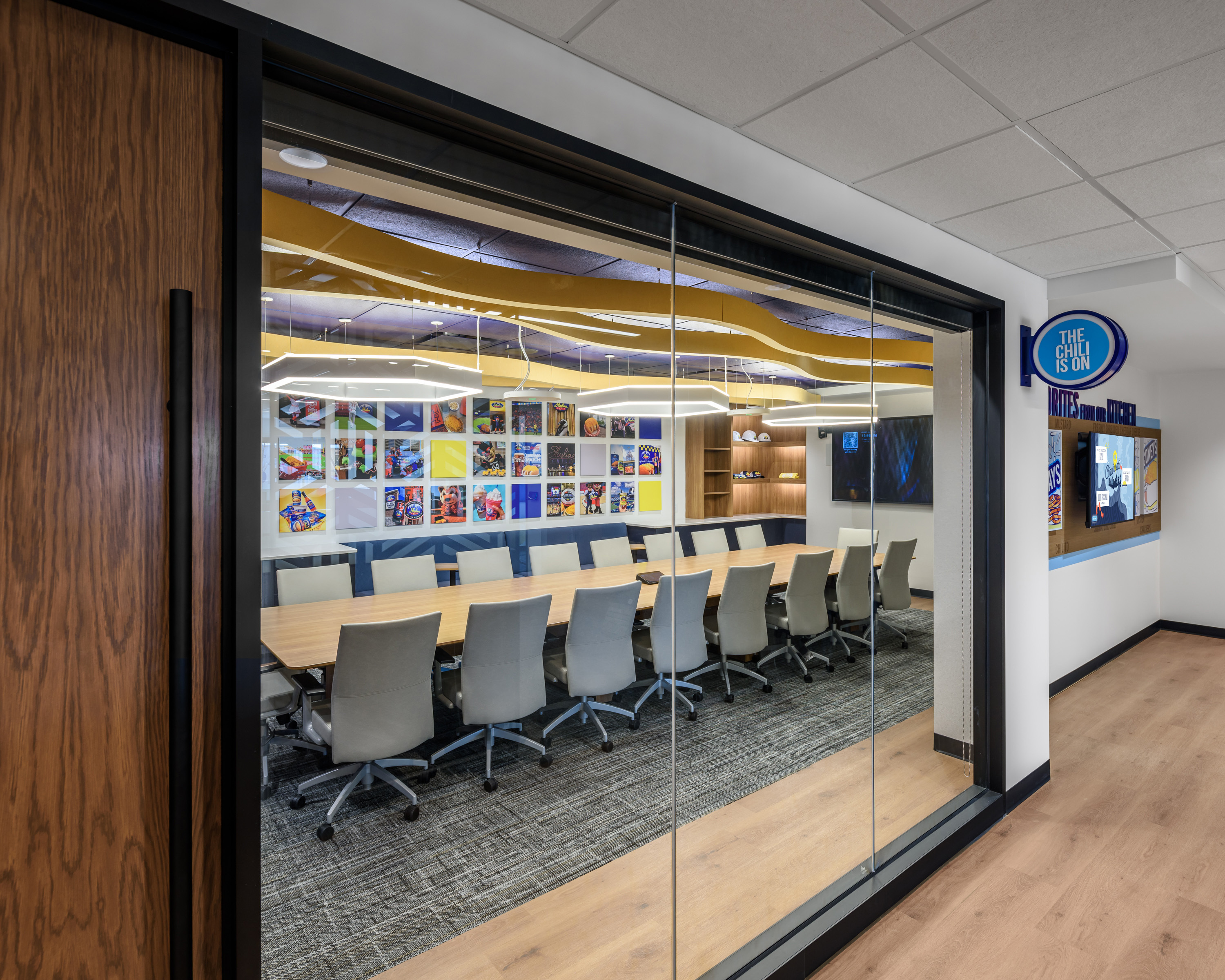 At the heart of the headquarters, the “Chili Is On” wall underscores Skyline’s proud tradition of making every batch of chili at the home office for both restaurants and retail. Above it, an illuminated sign signals when a new batch is cooking, turning an everyday process into a joyful ritual that connects staff and visitors to the brand’s heart.
