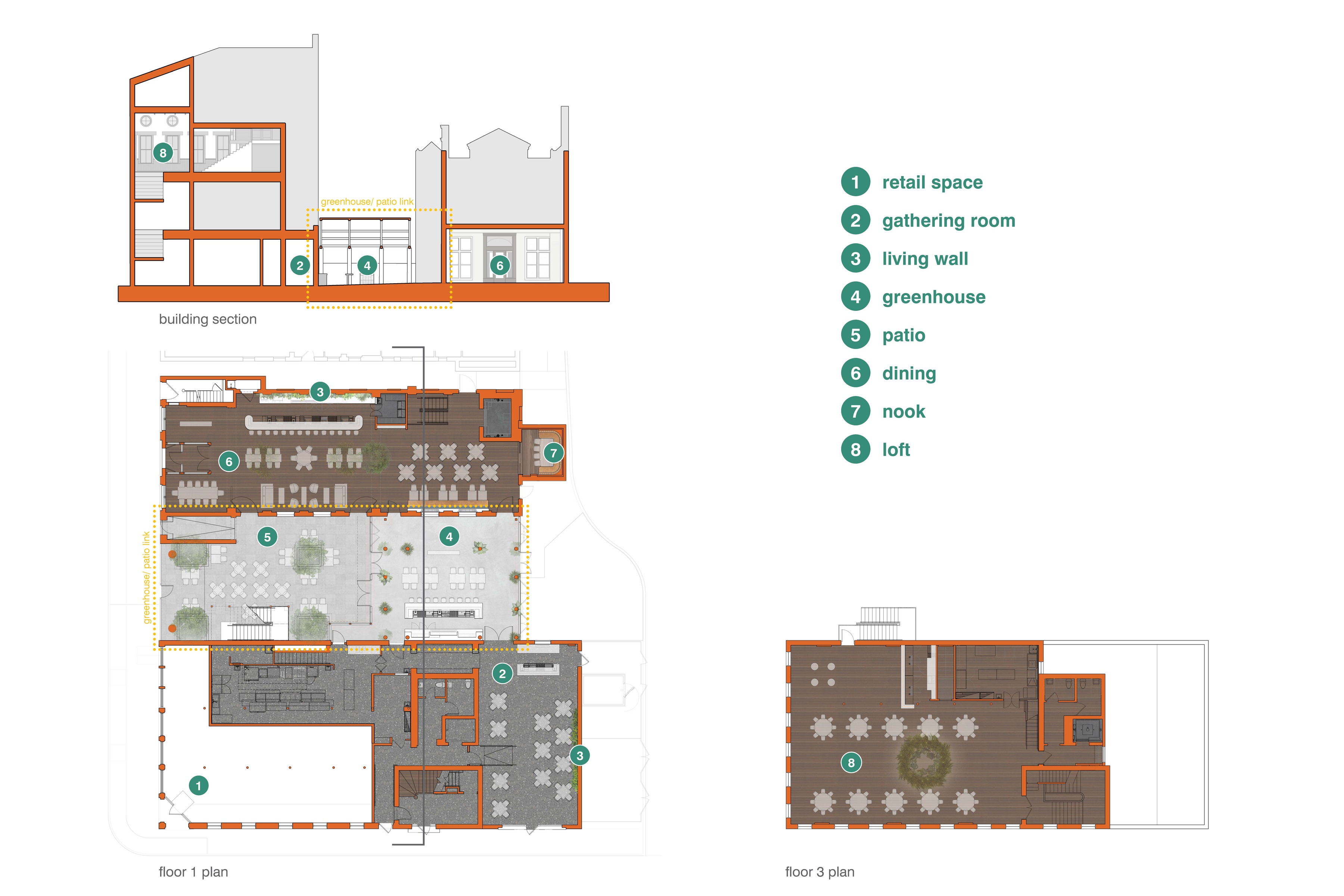 The project stitches together two Italianate buildings that flank a long-suffering garden lot. This lot is revived and supported by a greenhouse volume that houses a bar, covered seating… and of course lots of plants! As a kind of non-building, this greenhouse is a logical modern “hyphen” between the earlier Italianate buildings. It unifies the overall plan, while maintaining the transparency of the courtyard and the integrity of the historic structures. This sensitivity earned the project state and federal historic tax credits, a testament to the diligent care taken in preservation.