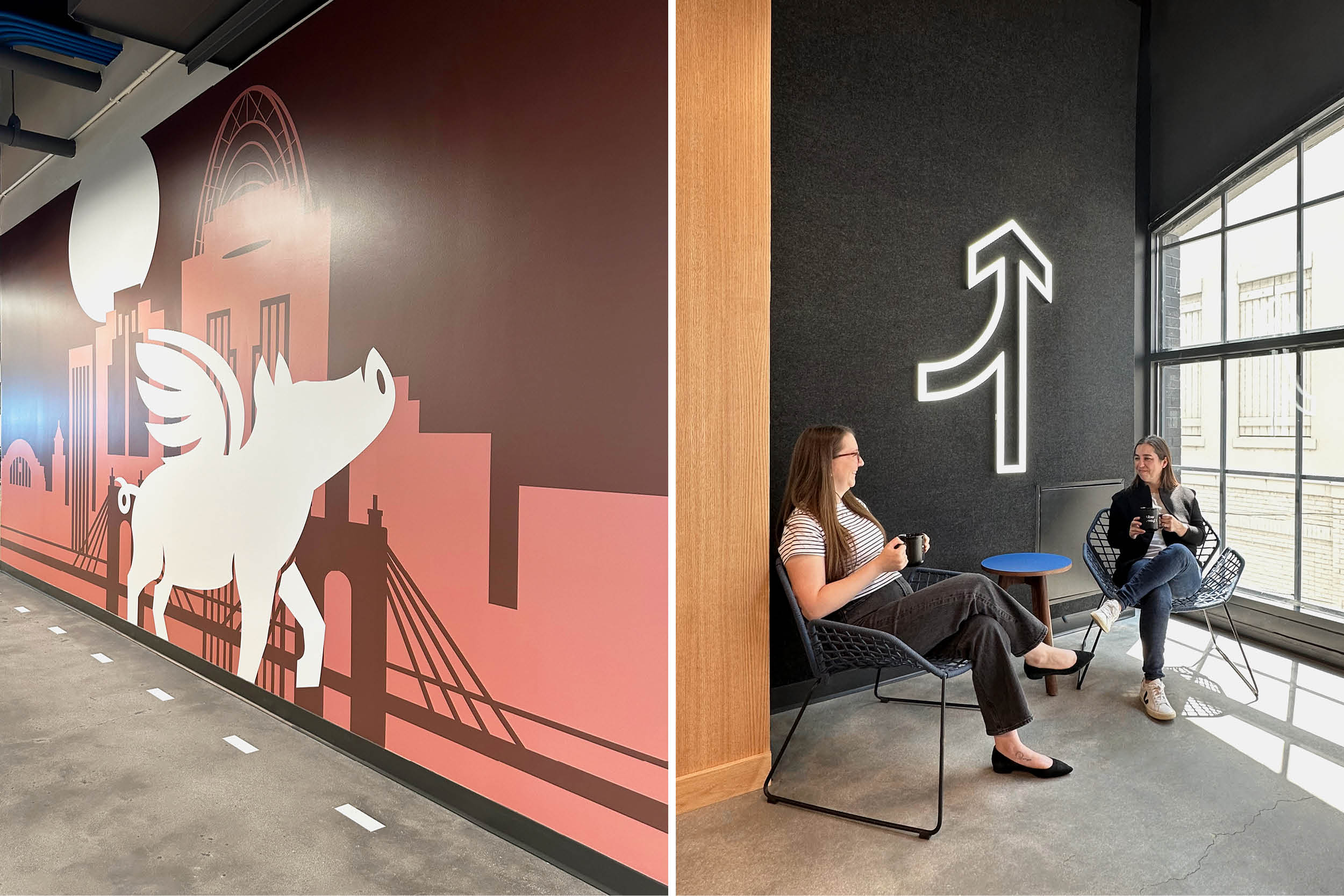 Set within Newport on the Levee, the workplace also connects Uber Freight to the surrounding community, integrating the brand into a dynamic urban context. Employees and visitors alike experience the company as accessible, vibrant, and deeply connected to place.