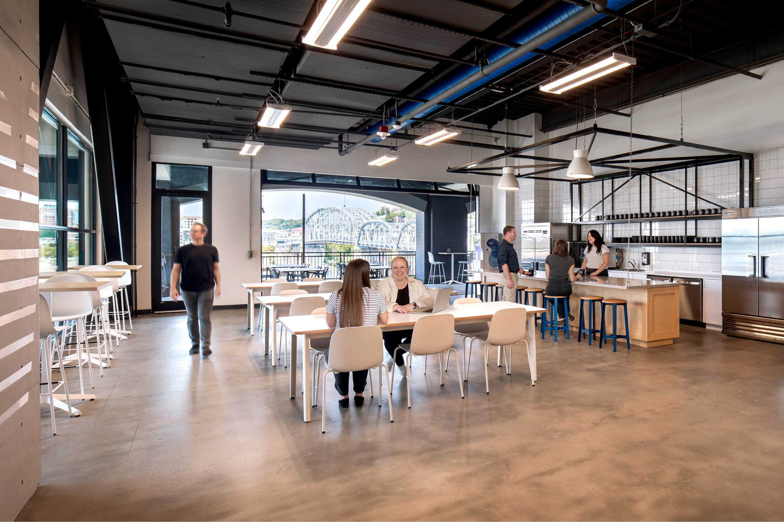 The experience extends beyond the walls. A 2,000-square-foot private patio overlooking the Ohio River and Cincinnati skyline becomes a branded moment of contrast: a pause amid constant movement. It communicates balance—acknowledging the intensity of logistics while honoring the human need for restoration.