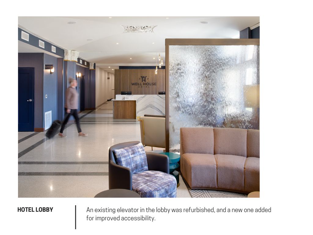 The project also improved its setting. In partnership with the city, a portion of South Monument Avenue was redesigned with streetscaping and parking to serve the Well House and nearby cultural destinations. Stepping into the restored lobby, guests encounter echoes of 1920s grandeur, carefully reinterpreted for today. The hotel offers 54 suites, a fitness center, breakfast area, conference rooms, and a full-service restaurant with outdoor dining. Guest suites balance historic character with tiled bathrooms, updated finishes, and layouts that prioritize livability.